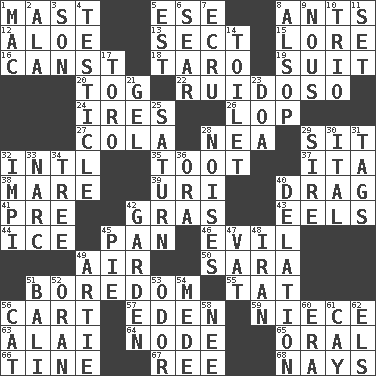 ACROSS 1. Vertical spar for supporting sails 5. Compass dir. 8. Pismires 12. _ vera 13. Religious group 15. Old wives' tales, e.g. 16. 2nd pers. sing. pres. of can (arch.) 18. Pacific island yam 19. Costume for a special activity 20. Coat; cloak 22. Boisterous (Brazilian Portuguese) 24. Angers 26. Trim (branches) 27. Root beer relative 28. Teachers' org. 29. Be seated 32. International (abbr.) 35. A blast of a horn 37. Call ___ day 38. Female horse 39. RI univ. 40. To be drawn or hauled along 41. Before (prefix) 42. Pate de foie ____ 43. Snakelike fish 44. Frozen water 45. Baking dish 46. Tending to cause great harm 49. Atmosphere 50. "Two Mules for Sister ____" 51. Mood resulting from idleness 55. Make lace 56. Draw slowly or heavily 57. Genesis locale 59. Sibling's daughter 63. Jai ____ 64. Connecting point 65. Taken by mouth 66. Prong on a fork 67. Portuguese money of account (variant) 68. Negative votes DOWN 1. Big _ 2. According to 3. Male offspring 4. One of the two male reproductive glands 5. Eastern Standard Time (abbr.) 6. Shrivel 7. Shade of tan 8. Columnist Joseph or Stewart 9. Good sense 10. Musical group of three 11. Put into a specified state 14. Bathroom 17. "Corrida" creature 21. Set 23. ___ good deed 25. Titan orbits this 28. Annoying sounds 29. Beget 30. Slanted text style (abbr.) 31. Labels 32. Body of Kaffir warriors 33. Drug cop 34. Family _ (genealogy) 36. Mouth or opening 40. Accusation by an informer 42. Place where plants grow 45. Sliced dessert 47. Large container 48. SW Asia republic 49. Nick name for Arthur 51. Indonesian resort city 52. NW Algerian seaport 53. Aroma 54. Ancient Persian 56. Domesticated feline 58. Born 60. Period 61. Island 62. Raised railways