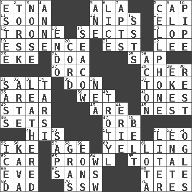 ACROSS 1. Inactive volcano in Sicily 5. Chicken ___ king 8. Head covering 11. Within a short period 12. Pinches, bites 14. Biblical high priest 15. Marketplace scale 17. Religious groups 18. Trim (branches) 19. Core 21. Eastern Standard Time (abbr.) 22. Area sheltered from the wind 23. Supplement with great effort 24. ___ good deed 25. Plant excrement 27. The grampus (Milton) 28. "Mermaids" star 31. Table seasoning 35. Spanish title 37. Puff or smoke 38. Type of rug 39. Dripping 41. Washington bills 42. Play the lead 43. "We ___ not amused" (Victoria) 45. Egg locale 46. Arranges properly for use 47. Globe 49. Part of HMS, perhaps 51. Standoff 52. Lion 55. Mamie's mate 57. Personal question 60. Crying or shouting loudly 62. Auto 63. Move like a hungry wolf 65. "_____ Recall" 66. First lady 67. Without 68. False hair 69. Male parent 70. Compass dir. 71. Ancient Greek god of war DOWN 1. First name in cosmetics 2. Cod relative 3. Trap for birds or small mammals 4. Singer Murray 5. One (Scot) 6. Louse (plural) 7. Flats, for short 8. Portable communications device 9. Medicinal plant 10. Corncob 13. Fast planes 16. Inside; within (prefix) 17. Manatee 20. Drawstring 26. NE Massachussets city 29. Makes supply last 30. Repose 31. Backtalk 32. Johnson of "Laugh-In" 33. Tough but pliablecoriaceous 34. Tarsus (plural) 36. Teachers' org. 40. TNT 44. One of the Great Lakes 48. Waist strap 50. Plant excrements 52. 61 cubic inches 53. Maternal 54. Stares at amorously 55. On the rocks 56. Polynesian shrub of the pepper family 58. Pate de foie ____ 59. Immeasurably long periods of time 61. Globular water bottle used in Asia 64. Compass dir.