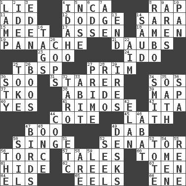 ACROSS 1. Untruth 4. South American Indian 8. Reproach for some lapse or misdeed 11. Increase 12. Evade 14. "Two Mules for Sister ____" 15. Confront 17. NE Netherlands city 18. So be it 19. Flamboyance 21. Applies to a surface 23. Thick or sticky substance 24. Wedding promise 25. Cook's measure (abbr.) 27. Demure 30. "Barney Miller" actor Jack 31. A viewer who gazes fixedly 34. Mayday 37. Ring climax 38. Tolerate 39. Atlas unit 40. It is so 41. Full of chinks, cracks, or crevices 43. Call ___ day 44. ____ d'Azur (French Riviera) 45. Thin strip of wood or metal 47. Surprise greeting 49. Pat or tap gently 50. Burn superficially 52. Legislator 56. Torque (variant) 57. Lies 60. Heavy book 61. Flintstone garb 62. Small stream 63. "___ Little Indians" 64. Raised railways 65. Snakelike fish 66. Compass dir. DOWN 1. Desk light 2. The main thing one is thinking about 3. Genesis locale 4. Potato state 5. Characteristic smell of wine 6. Music discs 7. Personal question 8. Role for Stallone 9. Ancient Greek god of war 10. Baking dish 13. Conclude 14. Saudi Arabian king (1953-1964) 16. Labels 20. 911 reaches them 22. Direct toward a target or goal 25. Casino tip 26. Expressions of contempt or scorn 27. First class 28. Do over again 29. Angers 30. Filthy place 32. Pacific island yam 33. "This won't hurt ____!" 34. Stricken, poetically 35. Pledge 36. Health resort 42. Liveliness 44. Gear tooth 46. Blind as ____ 47. Avian creatures 48. At one time in the past 49. Writing tables 50. The visible part of the earth's surface 51. And so on (abbr.) 52. Stitch closed the eyes of (a falcon) 53. Haul 54. Sign of something about to happen 55. French philosopher Descartes 56. Definite Article 58. "We ___ not amused" (Victoria) 59. Area sheltered from the wind