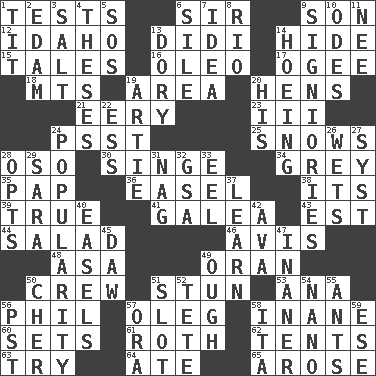 ACROSS 1. Trials 6. Title for a knight 9. Boy, to dad 12. Potato state 13. "You Light Up My Life" star Conn 14. Flintstone garb 15. Lies 16. Margarine 17. Double curve, resembling the letter S 18. Mountains (abbr.) 19. Type of rug 20. Coop moms 21. Suggestive of the supernatural 23. One more than two 24. Inconspicuous attention getter 25. Frozen precipitation (plural) 28. Bear (Spanish) 30. Burn superficially 34. Jennifer or Joel 35. Infant food 36. Artist's stand 38. It is 39. Loyal 41. An organ shaped like a helmet 43. Eastern Standard Time (abbr.) 44. Vegetable dish 46. Opinion 48. White ___ sheet 49. NW Algerian seaport 50. Ship's personnel 51. Astound 53. Santa ___, CA 56. Silvers or Donahue 57. Cassini of fashion 58. Lacking in sense or substance 60. Arranges properly for use 61. Writer of Portnoy's Complaint (1969) 62. Portable shelters 63. Attempt 64. Had dinner 65. Came up DOWN 1. Teat (slang) 2. Dutch treat 3. Table seasoning 4. College papers 5. Distress signal 6. Filth; sediment 7. The main thing one is thinking about 8. _ de Janeiro 9. Seigniories (variant) 10. Lyric poems 11. Born 13. Rowboat 14. Cultivating 19. Nick name for Arthur 20. Part of HMS, perhaps 22. Double-curved letter 24. Teen's desire 26. Moistens 27. System (abbr.) 28. Chooses 29. "Two Mules for Sister ____" 31. Tired old horse 32. Girls' org. (abbr.) 33. Snakelike fish 37. Acquire or gain knowledge or skills 40. Artist's stands 42. Actress Gardner 45. Obsolete 47. Sillier 49. Ending for "Through" and "Enough" 50. "Mermaids" star 51. Slit 52. Wig 54. Billionth: prefix 55. Pismires 56. Pacific Standard Time (abbr.) 57. Mouth or opening 58. Call ___ day 59. Compass dir.