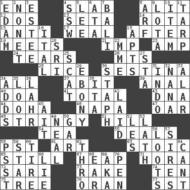 ACROSS 1. Compass dir. 4. Broad, flat, thick piece 8. Set down 12. Two (Sp.) 13. Stalk of a moss capsule 14. Round or rotation of duties 15. Against 17. Welt 18. Following 19. Confronts 21. Mischievous child 23. Electrical Unit 24. Lacerates 26. Mountains (abbr.) 28. Louse (plural) 30. French poetic form 34. 100% 37. "This won't hurt ____!" 39. Of or related to the anus 40. ___ good deed 41. "_____ Recall" 43. Heredity factor (abbr.) 44. Capital of the state of Qatar 46. California wine valley 47. Boat paddle 48. Slender, wiry 51. Land elevation 54. Afternoon social gathering 55. Allots cards 58. Pacific Standard Time (abbr.) 61. Tate display 63. Unemotional 65. Not moving 67. Pile 71. Israeli folk dance 72. Indian skirt 73. Immoral or dissolute person 74. "___ Little Indians" 75. Woody plant 76. NW Algerian seaport 77. Fast jet (abbr.) DOWN 1. Dutch treat 2. Music written for nine 3. First name in cosmetics 4. Compass dir. 5. Area sheltered from the wind 6. "One Day ___ Time" 7. Indonesian resort city 8. Sandy's bark 9. Globular water bottle used in Asia 10. A distinct part 11. Canvas cover 16. Slanted text style (abbr.) 18. Flats, for short 20. Indian title of respect (Mr.) 22. Madame (abbr.) 25. Go away! 27. R.R. building 29. Dark wood 30. Staphylococcus 31. Southeast Asian peninsula 32. Nanny 33. Having or resembling wings 34. Does sums 35. Plunder 36. Cowardly lion portrayer 38. Call ___ day 42. Put down 45. Small island 49. Actress Patricia 50. Slender fish 52. French article 53. Thin strip of wood or metal 56. Plunders 57. Founders of families 58. Inconspicuous attention getter 59. Play the lead 60. Become fatigued 62. Through, poetically 64. Patter 66. Untruth 68. Hearing organ 69. Alias (abbr.) 70. Writing instrument