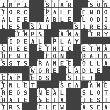 ACROSS 1. Body of Kaffir warriors 5. Play the lead 9. Male offspring 12. Torque (variant) 13. Diluted with white 14. Inside; within (prefix) 15. Toward shelter 16. Competent 17. Farming town in central California 18. French article 19. Be seated 21. Fathers 22. Naughty children 24. Nursemaid (var.) 26. Attempt to accomplish something 27. Standard of perfection 28. Romp 29. Algonquian 30. Moral principle 32. Inactive volcano in Sicily 36. Gouge 37. A really long time 38. Water falling in drops from the sky 39. Fast planes 40. The wife of a rajah (variant) 42. Water jar 43. Had on 44. Dipping utensil 46. Head covering 49. Greek goddess of the dawn 50. Proofreading order 51. An arm off of a larger body of water 53. Ocean 54. A saturated hydrocarbon 57. Vintage cars 58. Actress Patricia 61. Groove 62. Pace 63. Bristle 64. Trial 65. Big collection agency 66. Soared 67. Toward the sea DOWN 1. Slanted text style (abbr.) 2. Undercover agent 3. Elected leader of a country 4. Frozen water 5. Petty quarrel 6. Keyboard key 7. 100% 8. To riddle 9. Derisive sound 10. More peculiar 11. Annoyingly loud 14. Connecticut Ivy Leaguer 19. Health resort 20. Small island 21. Declare 23. Confronts 24. Place in a line 25. Big _ 27. Angers 28. Give a jingle 29. Music discs 31. Lacerates 32. Wear away 33. Baron Munchausen's specialties 34. "Death on the ____" 35. Santa ___, CA 40. Friend of Pooh 41. Otherwise 43. Soggy 45. "One Day ___ Time" 46. High-altitude cloud 47. Approach 48. Secret plans 52. Compass dir. 53. Cole _ (cabbage dish) 55. Characteristic smell of wine 56. Singer James 58. Overdraft (abbr.) 59. Snakelike fish 60. Had dinner 61. R.R. building