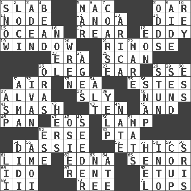 ACROSS 1. Thick slice 5. Apple computer (short form) 8. Boat paddle 11. Thickened enlargement 12. Small Philippine buffalo 14. Expire 15. Sea 17. Bring up, as a child 18. Whirlpool 19. Light entry point 21. Full of chinks, cracks, or crevices 23. Epoch 25. Examine hastily 26. Cassini of fashion 27. Hearing organ 28. Compass dir. 31. Atmosphere 33. Teachers' org. 35. _____ Park, CO 37. Inventor's middle name 38. Insidious 40. Religious women 41. Box-office sellout 43. Nine, plus one 45. Also 46. Baking dish 47. Greek goddess of the dawn 50. Desk light 52. Celtic language 53. Parent Teacher Association (abbr.) 54. Hyrax 56. Value system 61. Citrus frut 62. Pulitzer Prize-winning author Ferber 65. Sir (Sp.) 66. Wedding promise 67. Monthly bill 68. Needle case 69. One more than two 70. Portuguese money of account (variant) 71. Chops off DOWN 1. Overwhelm 2. Venues 3. An important port of Yemen 4. Necklace unit 5. Make imperfect 6. A saturated hydrocarbon 7. Rough 8. Probability 9. Assistant 10. Marina Del _, California 13. N. Chile seaport 16. Christmas carol 18. A really long time 20. Songbird 22. Female horse 24. Ripens 26. Mouths or openings 28. Astound 29. Transmit 30. Curvy letter 31. _ mater 32. "Terrible" tsar 34. Keyboard modifier key 36. Fastener 37. Viper 39. Sharp bark 42. Possessive pronoun 44. Nathan's nickname 48. Flexible twig of a willow tree 49. Sowing specialist 51. Floor protectors 52. Compass dir. 54. "You Light Up My Life" star Conn 55. Mine, in Marseilles 57. Person who is morally reprehensible 58. To the inside or interior of 59. Clever action or accomplishment 60. Indian titles of respect 61. Cards in a Roman deck? 63. Compass dir. 64. Had dinner