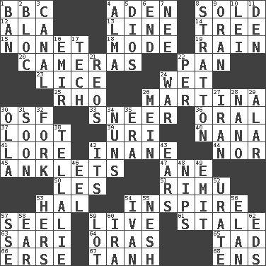 ACROSS 1. English channel? 4. Arabian gulf 8. Exchanged or delivered for money 12. In the manner of 13. Actor's bit 14. Family _ (genealogy) 15. Music written for nine 18. Method 19. Precipitation 20. Devices for capturing images 22. Baking dish 23. Louse (plural) 24. Soggy 25. 17th letter of the Greek alphabet 26. Chrissie's court nemesis 30. Order of Saint Francis (abbr.) 33. Contemptuous expression 36. Taken by mouth 37. Plunder 39. RI univ. 40. Grandmother 41. Old wives' tales, e.g. 42. Silly 44. Not either 45. Short socks 47. A saturated hydrocarbon 50. French article 51. Tall New Zealand timber tree 53. Actor Linden 54. Motivate 57. Sew up the eyelids of hawks and falcons 59. Moving, as bait 61. Showing deterioration from age 63. Indian skirt 64. Mouths or openings 65. Bit 66. Celtic language 67. Hyperbolic tangent 68. Followers of ems DOWN 1. Prohibit 2. Group of countries in special alliance 3. Lessep's creation 4. _ mater 5. "Vaya con ____" 6. Conclude 7. Born 8. Ski resort town in Vermont 9. NW Algerian seaport 10. Luau accessory 11. Lair 16. Independent ruler or chieftain 17. Technician 21. Vintage cars 22. For each 24. Armed conflict 26. Chow _ 27. SW Asia republic 28. Billionth: prefix 29. Having or resembling wings 30. Rounded earthenware pot or jar 31. Within a short period 32. Tined utensil 34. Religious women 35. Epoch 38. Copy Pinocchio 42. It is 43. Hearing organs 46. Snakelike fish 48. Pinches, bites 49. Send forth 52. A salt of uric acid 53. Possessive pronoun 54. "Terrible" tsar 55. Delicate 56. Style 57. Compass dir. 58. Ewer handle 59. Car dealer's back yard 60. Lyricist Gershwin 62. Begley and Asner