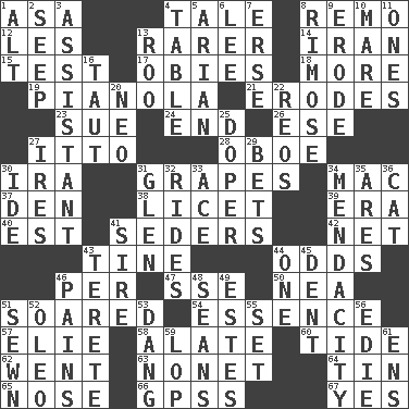 ACROSS 1. White ___ sheet 4. Story 8. San ____ (Riviera town) 12. French article 13. Less widely known 14. SW Asia republic 15. Trial 17. Off-Broadway awards 18. Greater amount 19. Player piano 21. Eats (away) 23. Take to court 24. Conclude 26. Compass dir. 27. "Tell ____ the Marines!" 28. Mitch Miller's instrument 30. Lyricist Gershwin 31. Wine fruits 34. Big _ 37. Lair 38. It is permitted: Lat. 39. Period 40. Eastern Standard Time (abbr.) 41. Spring feasts 42. Remaining after all deductions 43. Prong on a fork 44. Likelihood 46. For each 47. Compass dir. 50. Teachers' org. 51. Flew 54. Substance 57. Writer Wiesel 58. Having winglike extensions 60. Periodic rise and fall of the sea level 62. Left 63. Music written for nine 64. Metal container 65. Olfactory organ 66. Global Positioning Systems (abbr.) 67. It is so DOWN 1. Keyboard modifier key 2. Ooze 3. Aide 4. Eating place 5. Believer in; advocate of (suffix) 6. Area sheltered from the wind 7. Celtic language 8. Full of chinks, cracks, or crevices 9. Eat (away) 10. Female horse 11. Washington bills 13. Friend of Pooh 16. Drawn tight 20. Modern: prefix 22. Vintage cars 25. Drug addict 27. Angers 29. Antes 30. Binary compound 31. Small, secluded valley 32. Amusement-park features 33. Adept person 34. Ananias' fault 35. Ancient Greek god of war 36. Domesticated feline 41. Male parent of an animal 43. Cylindrical with tapered ends 44. Single 45. Gouge 46. Aches 48. Seines 49. _____ Park, CO 51. Stitched 52. Butter sub 53. Mild oath, euphamism for damn 55. Arrange properly for use 56. Singer Brickell 59. Chop off 61. Followers of ems