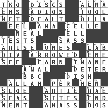ACROSS 1. Ring climax 4. Plates 9. _ mater 13. Followers of ems 14. Goodbye (Sp.) 15. Implement 16. Remaining after all deductions 17. Started a card game 18. Water jar 19. Snakelike fish 21. Nanny (var.) 22. Cell (Danish) 24. Actress Patricia 26. Pipe bend 27. Trials 29. Backtalk 30. Originate 31. Washington bills 33. Experiment locale 36. HTML Container Element 37. Moved like an arrow 40. Compass dir. 41. Observe 42. Merit 43. Lacking in sense or substance 45. Of or related to the anus 47. Prevent from occurring 48. English channel? 49. Food container 50. Assad's deity 52. For each 54. Layer 56. A type of plum 57. Nick name for Arthur 59. Actress Charlotte 61. Oceans 62. Locates 63. Conclusion 64. Gone 65. Collect or gather 66. Two (Sp.) DOWN 1. "___ Little Indians" 2. Leg joint 3. Clearly or manifestly demonstrative 4. June honoree 5. Standard of perfection 6. Thailand, formerly 7. Root beer relative 8. Fast jet (abbr.) 9. Ringlike coral islands and reefs 10. Hang loosely or laxly 11. Undercover agent 12. Insect wing 20. Allows 22. Stop 23. Raised railways 25. Toward the sea 27. Small amounts or degrees 28. One of the Great Lakes 29. Stitched 31. Spoken 32. Not either 33. Resembling or made to resemble leather 34. Queen of England 1702-14 35. Fermented drink made from hops 38. Arrive at 39. "You Light Up My Life" star Conn 44. Tender 45. Most capable 46. Basketball assoc. 49. Frees from moisture 50. Toward shelter 51. Grant temporary use of 52. Demure 53. Singer James 55. Billionth: prefix 56. Compass dir. 57. White ___ sheet 58. Double-curved letter 60. Begley and Asner