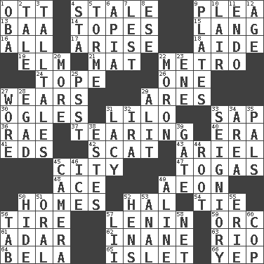 ACROSS 1. Baseball player Mel 4. Having lost freshness 9. Entreaty 13. Sound made by sheep 14. Drinks excessively 15. Long (Scottish) 16. 100% 17. Get up 18. Assistant 19. Shade tree 21. Floor protector 22. Paris' subway 24. Drink excessively 26. Single 27. Erodes 29. Ancient Greek god of war 30. Stares 31. _ and Stitch 33. Plant excrement 36. Actress Charlotte 37. Lacerating 40. Epoch 41. Begley and Asner 42. Go away! 43. Satellite of Uranus 45. Municipality 47. Ancient Roman robes 48. Adept person 49. Period of immesurable duration 50. Residences 52. Actor Linden 54. Neckwear 56. Hoop that covers a wheel 57. Soviet premier 1918-24 59. The grampus (Milton) 61. The sixth month of the Jewish calendar 62. Empty; void 63. River (Sp.) 64. Actor Lugosi 65. Small island 66. Slangy assent DOWN 1. Chief or king in Benin or Nigeria 2. Falsehood 3. Baron Munchausen's specialties 4. R.R. building 5. Singer Mel 6. Capital of Western Samoa 7. For fear that 8. Compass dir. 9. Food holders 10. Den 11. Inside; within (prefix) 12. Personal question 20. Greater amount 22. Person of subnormal intelligence 23. Compass dir. 25. Inconspicuous attention getter 27. Had on 28. Mild oath 29. Came down and settled, as after flight 31. Made of lace 32. Retirement account (abbr.) 33. Signiory (variant) 34. Length times width 35. Friends 38. _____ Park, CO 39. Yard entry 44. Carrot, for example 45. Device for capturing images 46. Frozen water 49. Place in a line 50. Flintstone garb 51. Relating to the mouth 52. Coop moms 53. Of or related to the anus 55. One of the Great Lakes 56. Bar bill 57. Cards in a Roman deck? 58. Fish or hair follower 60. Police officer (slang)