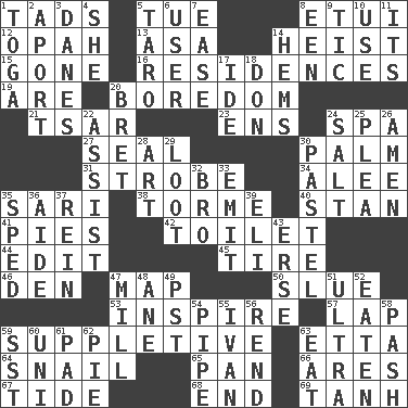 ACROSS 1. Small amounts or degrees 5. Third day of the wk. 8. Needle case 12. Brightly colored fish 13. White ___ sheet 14. Robbery 15. Went 16. Dwellings 19. "We ___ not amused" (Victoria) 20. Mood resulting from idleness 21. Russian ruler of old 23. Followers of ems 24. Health resort 27. Lick closed 30. Inside of hand 31. Disco prop 34. Toward shelter 35. Indian skirt 38. Singer Mel 40. Comedian Laurel of Laurel & Hardy 41. Sliced desserts 42. Rest room 44. Prepare for publication 45. Hoop that covers a wheel 46. Lair 47. Atlas unit 50. Turn sharply 53. Heighten or intensify 57. Pet locale 59. Supplying deficiencies 63. Singer James 64. Slow-paced one 65. Baking dish 66. Ancient Greek god of war 67. Periodic rise and fall of the sea level 68. Conclude 69. Hyperbolic tangent DOWN 1. Ancient Roman robe 2. To the left, to Queeg 3. Natives or inhabitants of Denmark 4. A female animal or person 5. Edible starchy tuberous root 6. One who makes use of a thing 7. Relaxation 8. Car or cant ending 9. Nervous spasm 10. Purpose 11. It is 14. Equivocates 17. Binary compound 18. Spanish title 20. Cy Young winner Saberhagen 22. Aid 24. Table seasoning 25. Entreaty 26. So be it 28. Tate display 29. Plunder 30. Soft color 32. Sis' sibling 33. Send forth 35. Broke a traffic law 36. Assistant 37. It's straight from the horse's mouth 39. Biblical high priest 43. Celtic language 47. Place where flour is made 48. A saturated hydrocarbon 49. Pacific Standard Time (abbr.) 51. Extreme 52. Eroded 54. Corncob 55. "Terrible" tsar 56. Tear apart 58. Romantic infatuation 59. Fast jet (abbr.) 60. Single; one (prefix) 61. Writing tablet 62. Sliced dessert 63. Erode