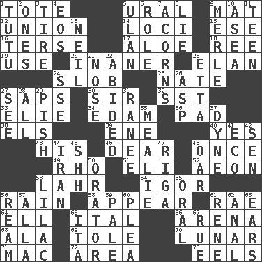 ACROSS 1. Haul 5. Mountain range 9. Floor protector 12. The state of being joined or united 14. Event scenes 15. Compass dir. 16. Laconic 17. Medicinal plant 18. To riddle 19. Purpose 20. More empty; more void 23. Flair 24. Messy guy 25. Nathan's nickname 27. Plant excrements 30. Title for a knight 32. Fast jet (abbr.) 33. Writer Wiesel 34. Dutch treat 36. Groovy apt. 38. Raised railways 39. Compass dir. 40. It is so 43. Part of HMS, perhaps 46. Letter starter 48. At one time in the past 49. 17th letter of the Greek alphabet 51. Connecticut Ivy Leaguer 52. A really long time 53. Cowardly lion portrayer 54. Composer Stravinsky 56. Water falling in drops from the sky 58. Seem 61. Actress Charlotte 64. Pipe bend 65. Slanted text style (abbr.) 66. Sports stadium 68. Insect wing 69. Lacquered or enameled metalware 70. Type of eclipse 71. Apple computer (short form) 72. Type of rug 73. Snakelike fish DOWN 1. Ballerina skirt 2. Washington bills 3. Become fatigued 4. Greek goddess of the dawn 5. ____ Bator, Mongolia 6. Hero or heavy, e.g. 7. Oak nuts 8. Untruth 9. Haggard of country music 10. At sea 11. Adolescent 13. Famous astronaut Armstrong 21. Characteristic smell of wine 22. Tolerated 23. Singer James 24. Compass dir. 26. Viper 27. Observe 28. Everything 29. Expression of disdain 31. Indian princess (variant) 35. Ear of corn 37. Centimeter-gram-second unit of force 41. Environmental prefix 42. Elected rep. 44. SW Asia republic 45. Quiet! 47. Port city in Latvia 48. Rowing implement 50. Speaker 53. Pale purple color 55. Spoken 56. 480, 500 or 516 sheets of paper 57. Silent film actress Nazimova 59. Diluted with white 60. Entreaty 61. French philosopher Descartes 62. Of or related to the anus 63. Hearing organs 65. Call ___ day 67. Sorrow