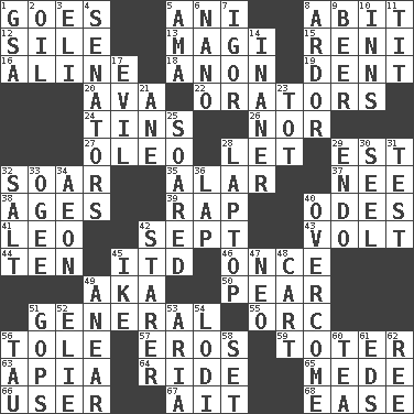 ACROSS 1. Leaves 5. Black tropical American cuckoo 8. "This won't hurt ____!" 12. Drop; flow; fall 13. Wise men 15. Painter Guido (1575-1642) 16. Place in a line 18. Soon (poet.) 19. Gouge 20. Actress Gardner 22. Speakers 24. Metal containers 26. Not either 27. Margarine 28. Allow 29. Eastern Standard Time (abbr.) 32. Fly high 35. Having or resembling wings 37. Born 38. Grows older 39. Reproach for some lapse or misdeed 40. Lyric poems 41. Lion 42. Back-to-school mo. 43. Electrical Unit 44. Nine, plus one 45. It would 46. Single time 49. Alias (abbr.) 50. Lightbulb-shaped fruit 51. Commissioned military rank 55. The grampus (Milton) 56. Lacquered or enameled metalware 57. Greek god of love 59. Carrier 63. Capital of Western Samoa 64. Travel on an animal 65. Ancient Persian 66. One who makes use of a thing 67. Small island 68. Relaxation DOWN 1. Girls' org. (abbr.) 2. Petroleum 3. Biblical high priest 4. Elected representatives 5. Nursemaid (var.) 6. Billionth: prefix 7. Composer Stravinsky 8. Zeal 9. Fermented drink made from hops 10. Taverns 11. Teat (slang) 14. More lacking in sense or substance 17. Tending to cause great harm 21. A saturated hydrocarbon 23. Small child 25. Flew 28. Portable computer 29. Inside; within (prefix) 30. Sew up the eyelids of hawks and falcons 31. Trial 32. Table seasoning 33. Double curve, resembling the letter S 34. Period of immesurable duration 36. Infant locale 40. Conquer 42. A viewer who gazes fixedly 45. Mamie's husband 47. Modern: prefix 48. Haul 49. Approach 51. Republicans 52. Writer Wiesel 53. Roberta Peters solo 54. Farming town in central California 56. The 19th letter of the Greek alphabet 58. Arrange properly for use 60. Afternoon social gathering 61. Begley and Asner 62. To riddle