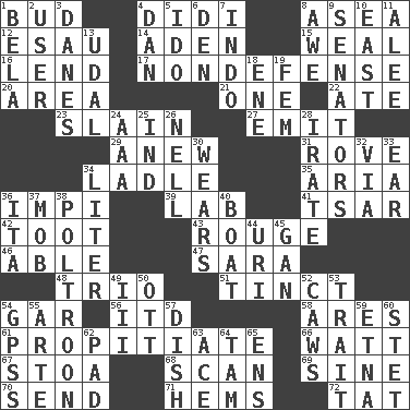 ACROSS 1. Partially opened flower 4. "You Light Up My Life" star Conn 8. Toward the sea 12. Son of Isaac 14. An important port of Yemen 15. Welt 16. Grant temporary use of 17. Unrelated to defense, as in spending 20. Length times width 21. Single 22. Had dinner 23. Killed 27. Send forth 29. Afresh 31. Be footloose 34. Dipping utensil 35. Operatic vocal solo 36. Body of Kaffir warriors 39. Experiment locale 41. Russian ruler of old 42. A blast of a horn 43. Makeup applied to the cheeks 46. Competent 47. "Two Mules for Sister ____" 48. Musical group of three 51. Colored lightly or faintly 54. Slender fish 56. It would 58. Ancient Greek god of war 61. Appease 66. Electrical Unit 67. Portico 68. Examine minutely or intensely 69. Trig term 70. Transmit 71. Equivocates 72. Make lace DOWN 1. Actor Lugosi 2. One who uses or employs something 3. Natives or inhabitants of Denmark 4. Daniel's nick name 5. Wedding promise 6. Lair 7. _ china 8. Deep reverence 9. Elected representatives 10. 90 degrees 11. Toward shelter 13. Allodial 18. Compass dir. 19. Opposite of masc. 24. Auto club (abbr.) 25. Indiana (abbr.) 26. 1994 drama film starring Jodie Foster 28. Feeling or showing extreme anger 30. Puts on (as clothing) 32. By way of 33. Ewer handle 34. 61 cubic inches 36. Call ___ day 37. Crowd into 38. Coward 40. Water vessel 44. RI univ. 45. Separate the seeds from cotton 49. One more than two 50. Baseball player Mel 52. Crow sounds 53. Distinguishing feature 54. Global Positioning Systems (abbr.) 55. Johnson of "Laugh-In" 57. Food container 59. Inactive volcano in Sicily 60. Proofreading order 62. Writing tablet 63. Adept person 64. Scottish cap 65. Followers of ems
