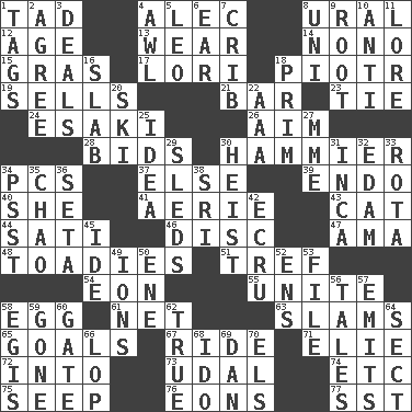 ACROSS 1. Small amount or degree 4. Actor Baldwin 8. Mountain range 12. Ripen 13. Put on (as clothing) 14. Words to Nanette 15. Pate de foie ____ 17. Australian parrot (variant) 18. Peter (Polish) 19. Exchanges for money 21. Oblong piece of solid material 23. Neckwear 24. 1973 Nobel Price Winner (Physics) Leo 26. Direct toward a target or goal 28. Auction offers 30. More overdramatic by comparison 34. Personal Computers (abbr.) 37. Otherwise 39. Inside; within (prefix) 40. A female animal or person 41. Nest on high 43. Feline 44. Suttee (variant) 46. Plate 47. Nursemaid (var.) 48. Sycophants 51. Unclean, religiously 54. Period of immesurable duration 55. Join together 58. Ovum 61. Fish or hair follower 63. Criticizes harshly 65. Purposes of endeavors 67. Travel on an animal 71. Writer Wiesel 72. To the inside or interior of 73. Allodial 74. And so on (abbr.) 75. Ooze 76. Immeasurably long periods of time 77. Fast jet (abbr.) DOWN 1. Labels 2. Match 3. Allots cards 4. Leather borer 5. Lion 6. Ewer handle 7. Baby bed with high sides 8. University (slang) 9. Carrot, for example 10. Opposed to 11. Old wives' tales, e.g. 16. Broad, flat, thick piece 18. Demure 20. What Jean-Claude Killy likes to do 22. Auto club (abbr.) 25. The content of cognition 27. Madame (abbr.) 29. Bobsleighs 30. Robbery 31. South American Indian 32. Dutch treat 33. Roll call or roster of names 34. Inconspicuous attention getter 35. US Secretary of Labor Elaine L. _ 36. Bristle 38. _ Lanka 42. Shade of tan 45. Binary compound 49. Charged particles 50. Compass dir. 52. Followers of ems 53. Do some clerical work 56. Lies 57. Sends forth 58. Armor plate that protects the chest 59. Went 60. Yard entry 62. Loyal 64. Religious group 66. Chop off 68. Wedding promise 69. Daniel's nick name 70. Raised railways