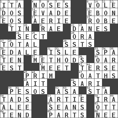 ACROSS 1. Call ___ day 4. Olfactory organs 9. Short-tailed, large-bodied rat 13. Two (Sp.) 14. Elude 15. Inky black, to poets 16. Greek goddess of the dawn 17. Nest on high 18. Loose flowing garment 19. Metal container 21. Actress Charlotte 22. Natives or inhabitants of Denmark 24. Religious group 26. Mouth or opening 27. Add up to 29. Fast planes 30. Peak District village in England 31. Capri or Wight 33. Health resort 36. "___ Little Indians" 37. Modes 40. Rowing implement 41. Eastern Standard Time (abbr.) 42. Confront 43. Laconic 45. Demure 47. Expletives 48. Small island 49. Indian skirt 50. Mexican monetary units 52. White ___ sheet 54. R.R. building 56. Bits 57. Nick name for Arthur 59. Lyricist Gershwin 61. Toward shelter 62. Actors Connery and Penn 63. Baseball player Mel 64. Be inclined (to) 65. Pieces 66. Born DOWN 1. Binary compound 2. A blast of a horn 3. Aide 4. Teachers' org. 5. Unconcealed 6. "Two Mules for Sister ____" 7. Singer Brickell 8. Perceive with the eye 9. Actresses Bloom and Felton 10. Mitch Miller's instrument 11. Tennis shots 12. Compass dir. 20. Anneal 22. Administered medicine 23. Nonscientific branch of learning 25. Clement's nick name 27. False hair 28. Lyric poems 29. Groove 31. A distinct part 32. A female animal or person 33. Conclusion 34. Romantic infatuation 35. Ancient Greek god of war 38. Sends forth 39. Portico 44. Hearing organs 45. Went by 46. _ de Janeiro 49. Inhabitant of Heaven 50. Light colored 51. Locale of original sin 52. Type of rug 53. Play the lead 55. Johnson of "Laugh-In" 56. Make lace 57. Cleo's killer 58. Double-curved letter 60. Had dinner