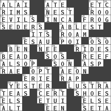 ACROSS 1. Mountain range southwest of Kyrgyzstan 5. Had dinner 8. And so on (abbr.) 11. Basketball hoops 12. Egg locale 14. Friend of Pooh 15. Vices 17. South American Indian 18. Toadlike animal 19. Spring feasts 21. Most capable 23. It is 25. Wander aimlessly 26. He sold his birthright 27. Luau course 28. Bear (Spanish) 31. Benjamin's nick name 33. Born 35. Amusement-park features 37. Necklace unit 38. Mayday 40. Coral collection 41. Columnist Joseph or Stewart 43. Boy, to dad 45. Cleo's killer 46. Actress Charlotte 47. Choose 50. A really long time 52. One of the Great Lakes 53. Reproach for some lapse or misdeed 54. Last 56. A period of five years 61. Beverages made from leaves 62. Sure thing 65. Imelda's hoard 66. Raised railways 67. Needle holder 68. Otherwise 69. Keyboard modifier key 70. Car or cant ending 71. Bristle DOWN 1. Ancient Greek god of war 2. Moving, as bait 3. Among 4. Capri or Wight 5. Cuckoo 6. "___ Little Indians" 7. Fortification 8. Blunders 9. A blast of a horn 10. Gear tooth 13. Off limits 16. Indian titles of respect 18. Opposite of masc. 20. Comedian Laurel of Laurel & Hardy 22. Den 24. Takes to court 26. Inside; within (prefix) 28. Lyric poems 29. Ooze 30. Order of Saint Francis (abbr.) 31. Actor Lugosi 32. Comfort 34. Greek goddess of the dawn 36. SW Asia republic 37. Long, evenly shaped piece 39. Fly high 42. Sweet dark-red dessert wine 44. Anneal 48. Component 49. Cylindrical with tapered ends 51. Musical composition 52. Double-curved letter 54. Shout 55. 90 degrees 57. "______ My Girl" (Turtles hit) 58. Lacquered or enameled metalware 59. Respite 60. At sea 61. Beverage made from leaves 63. Regret 64. Shallow baking pan