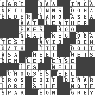 ACROSS 1. Legendary monster 5. Sound made by sheep 8. South American Indian 12. Famous astronaut Armstrong 13. Taverns 15. Capital of the state of Qatar 16. A person who is older than you are 18. Billionth: prefix 19. At sea 20. Large container 22. Cordwainer's material 24. Makes supply last 26. Friend of Pooh 27. Be tempered by heat 28. Barrel 29. Chief or king in Benin or Nigeria 32. Trial 35. Enthusiastic 37. Benjamin's nick name 38. Pledge 39. Teat (slang) 40. Stupid person 41. White ___ sheet 42. Rendezvous 43. Soaks 44. Lair 45. Directed 46. Celtic language 49. French article 50. 1994 drama film starring Jodie Foster 51. Opts 55. Snakelike fish 56. Greek god of love 57. Prepare for publication 59. Middle Eastern gold or silver currency 63. Old wives' tales, e.g. 64. Filth; sediment 65. Short letter 66. Coast Guard woman 67. A really long time 68. Jennifer or Joel DOWN 1. Single 2. Set 3. To free from 4. Veterans Day date 5. Storage container 6. Of or related to the anus 7. Singer Murray 8. Potato state 9. Sense of smell 10. "Mermaids" star 11. American Automobile Association (abbr.) 14. Flew 17. Libertine 21. Beverage made from leaves 23. Coat; cloak 25. Scheduled 28. Baby cat 29. Mitch Miller's instrument 30. Waist strap 31. Pismires 32. Frog relative 33. Comfort 34. Comedian Laurel of Laurel & Hardy 36. Compete 40. Home 42. Makes clutter 45. Lion 47. To sift 48. Downhill vehicle 49. Failure 51. Riding implement 52. Israeli folk dance 53. Singer Brickell 54. Grain storage tower 56. Raised railways 58. "___ Little Indians" 60. Not either 61. Had dinner 62. Marina Del _, California