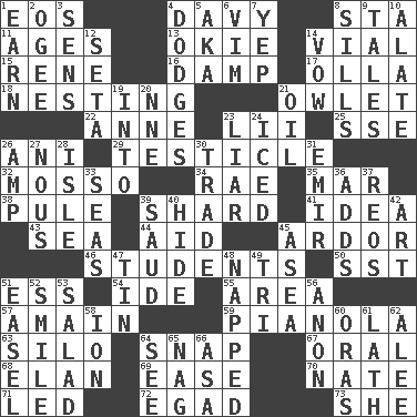 ACROSS 1. Greek goddess of the dawn 4. American folk hero Crockett 8. R.R. building 11. Eras 13. Migrant worker of the '30s 14. Small bottle 15. French philosopher Descartes 16. Moist 17. Spanish pot 18. Inhabiting a nest 21. A small or young owl 22. Singer Murray 23. Cards in a Roman deck? 25. Compass dir. 26. Black tropical American cuckoo 29. One of the two male reproductive glands 32. With motion or animation 34. Actress Charlotte 35. Impair 38. Whine 39. Pottery fragment 41. The main thing one is thinking about 43. Ocean 44. Help 45. Zeal 46. SAT takers 50. Fast jet (abbr.) 51. Curvy letter 54. Binary compound 55. Length times width 57. At full speed 59. Player piano 63. Grain storage tower 64. Fastener 67. Of the mouth 68. Style 69. Relaxation 70. Nathan's nickname 71. Directed 72. Mild oath 73. A female animal or person DOWN 1. Merit 2. Double curve, resembling the letter S 3. Elected reps. 4. Evades 5. Alias (abbr.) 6. Zeal 7. Slangy assent 8. Beverly of Met fame 9. Lies 10. Having winglike extensions 12. Bristle 14. Promise 19. To the inside or interior of 20. Compass dir. 21. Petroleum 23. One who doesn't tell the truth 24. On the rocks 26. Electrical Unit 27. Good sense 28. Small island 30. Exchange 31. Arab leader 33. Oceans 36. Sums up 37. Vintage cars 39. Saudi Arabian king (1953-1964) 40. Flintstone garb 42. Nonscientific branch of learning 45. Toward the sea 47. Shallow baking pan 48. Slept 49. Three (prefix) 51. Artist's stand 52. Grin 53. Vegetable dish 56. Soon (poet.) 58. Electrically charged atom 60. Mouths or openings 61. Thin strip of wood or metal 62. Toward shelter 64. Perceive with the eye 65. Tired old horse 66. White ___ sheet