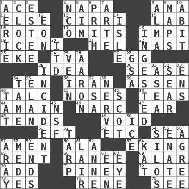 ACROSS 1. Adept person 4. California wine valley 8. Nanny (var.) 11. Otherwise 13. High-altitude cloud 15. Experiment locale 16. Printing process, for short 17. Leaves out 18. Body of Kaffir warriors 19. Ancient Celtic tribe of eastern Britain 21. Cartoonist voice _ Blanc 22. Political cartoonist Thomas 23. Make supply last 24. Federal power corp. 27. Oval reproductive body of a fowl 29. The content of cognition 30. Gospel singer Marvin 34. "___ Little Indians" 36. SW Asia republic 39. NE Netherlands city 40. Baby powder 41. Olfactory organs 43. Afternoon social gatherings 44. At full speed 46. Drug cop 47. Hearing organ 48. Looks after 49. Nothingness 51. Bank Draft (abbr.) 53. And so on (abbr.) 54. Ocean 57. So be it 60. Wing 63. Supplementing with great effort 65. Monthly bill 66. The wife of a rajah (variant) 69. Having or resembling wings 70. Say or write further 71. Abounding in pines 72. Haul 73. Affirmative reply 74. French philosopher Descartes 75. Observe DOWN 1. Nest on high 2. Timepiece 3. First name in cosmetics 4. Non-commissioned officer (abbr.) 5. Direct toward a target or goal 6. Demure 7. Johnson of "Laugh-In" 8. _ mater 9. Atlas contents 10. "This won't hurt ____!" 12. A really long time 14. Small island 18. Consumed 20. It would 25. Distinctive style or manner 26. Composer Copland 28. Girls' org. (abbr.) 29. Happening 31. At sea 32. Shrivel 33. Followers of ems 34. Docile 35. Enthusiasm 37. White ___ sheet 38. Boldness 40. Make lace 42. Highlander 45. Science/research agcy. 50. Frozen water 52. Canvas cover 54. Grain storage towers 55. Related on the mother's side 56. Match 57. Like ___ of sunshine 58. Ancient Persian 59. Extremities 61. Den 62. Singer Murray 64. Krazy ___ of comics 67. Car or cant ending 68. Sight organ