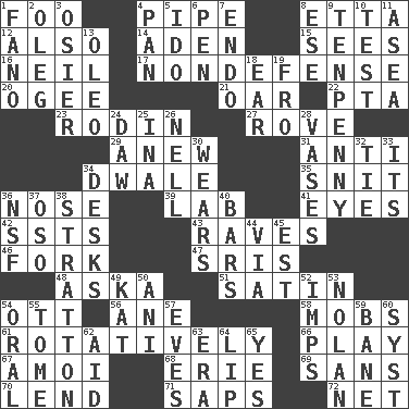 ACROSS 1. Egg _ yung 4. Corncob 8. Singer James 12. In addition 14. Arabian gulf 15. Perceives with the eye 16. Famous astronaut Armstrong 17. Unrelated to defense, as in spending 20. Double curve, resembling the letter S 21. Rowing implement 22. Parent Teacher Assoc. 23. "The Thinker" sculptor 27. Be footloose 29. Afresh 31. Against 34. A sleeping potion; an opiate (poet.) 35. In a ____ (agitated or irritated) 36. Characteristic smell of wine 39. Experiment locale 41. Snake ____ (dice throw) 42. Fast planes 43. All-night dance parties 46. Tined utensil 47. Indian titles of respect 48. "____ silly question..." 51. Smooth fabric 54. Baseball player Mel 56. One (Scot) 58. Disorderly crowds 61. Happening in regular succession 66. Live dramatic performance 67. Mine, in Marseilles 68. 4th largest of the Great Lakes 69. Without 70. Grant temporary use of 71. Plant excrements 72. Fish or hair follower DOWN 1. Papal veil 2. Cassini of fashion 3. Flexible twig of a willow tree 4. Baking dish 5. Wedding promise 6. Writing instrument 7. Inside; within (prefix) 8. Compass dir. 9. 3-inch nail 10. Trial 11. At sea 13. Butter sub 18. Hearing organ 19. Back 24. Simpleton 25. _ tizzy (2 wds.) 26. 1994 drama film starring Jodie Foster 28. Flower holders 30. Erodes 32. Make a knot 33. It is 34. Writing tables 36. Science/research agcy. 37. Bear (Spanish) 38. Ski resort town in Vermont 40. Long, evenly shaped pieces 44. By way of 45. Eastern Standard Time (abbr.) 49. Krazy ___ of comics 50. Cuckoo 52. Naughty children 53. Pitcher Ryan 54. Taken by mouth 55. Heavy book 57. Nights before holidays 59. Object of repulsion 60. System (abbr.) 62. Help 63. Epoch 64. Mouth edge 65. It is so