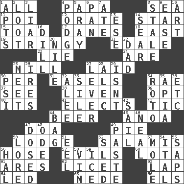 ACROSS 1. Everything 4. Dad 8. Ocean 11. Luau course 12. Speak pompously 14. Play the lead 15. Frog relative 17. Natives or inhabitants of Denmark 18. 90 degrees 19. Slender, wiry 21. Peak District village in England 23. Falsehood 24. "We ___ not amused" (Victoria) 25. Place where flour is made 27. Put down 30. For each 31. Artist's stands 34. Actress Charlotte 37. Observe 38. Make or become more lively 39. Elect 40. It is 41. Chooses 43. Nervous spasm 44. Fermented drink made from hops 45. Small Philippine buffalo 47. ___ good deed 49. Sliced dessert 50. Inn 52. Deli grouping 56. Flexible conduit 57. Vices 60. Globular water bottle used in Asia 61. Ancient Greek god of war 62. It is permitted: Lat. 63. Infant locale 64. Directed 65. Ancient Persian 66. Raised railways DOWN 1. Flats, for short 2. Spoils 3. One who doesn't tell the truth 4. Puddle 5. Like ___ of sunshine 6. Baking dish 7. Had dinner 8. Lacking originality or spontaneity 9. Relaxation 10. Nonscientific branch of learning 13. Compass dir. 14. Scorch 16. Deli pickle 20. Mediterranean tributary 22. June honoree 25. Confront 26. Angers 27. Prying instrument 28. Actor Baldwin 29. Is not 30. 23rd letter of the Greek alphabet 32. Toward shelter 33. Filth; sediment 34. Printing process, for short 35. Capital of Western Samoa 36. And so on (abbr.) 42. Move on water 44. Paper or plastic container 46. Actress Patricia 47. Administered medicine 48. Lyric poems 49. Thick mixture 50. Old wives' tales, e.g. 51. Snakelike fish 52. Downhill vehicle 53. Undercover agent 54. Slanted text style (abbr.) 55. Plant excrements 56. Actor Linden 58. Zeal 59. Frozen water