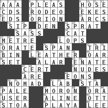 ACROSS 1. American Automobile Association (abbr.) 4. Entreaties 9. Stockings 13. Music discs 14. Cowboy competition 15. Makes supply last 16. Begley and Asner 17. Constellation of myth 18. Curves 19. Small drink 21. Lair 22. Small fatty European fish 24. Backtalk 26. Feline 27. Distance measurement (Brit.) 29. Chops off 30. Speak pompously 31. Connect, as a bridge 33. Three (prefix) 36. Storage container 37. Cordwainer's material 40. Boat paddle 41. Put into a specified state 42. Having or resembling wings 43. Related on the mother's side 45. Certainty 47. Unadorned figures 48. "We ___ not amused" (Victoria) 49. Immeasurably long periods of time 50. Wanderer 52. Experiment locale 54. R.R. building 56. Light colored 57. Person of subnormal intelligence 59. Mouth or opening 61. One who makes use of a thing 62. Place in a line 63. Baseball player Mel 64. Portico 65. Beach, in Buenos Aires 66. Area sheltered from the wind DOWN 1. Adept person 2. Does sums 3. Helper 4. Adept person 5. Domineers 6. Singer Brickell 7. Period of immesurable duration 8. Manchild 9. Centers of feelings and intuitions 10. Gumbo ingredient 11. Religious group 12. Curvy letter 20. Piece 22. Biscuitlike quick bread 23. Infant food 25. Stitch closed the eyes of (a falcon) 27. Crowds into 28. 4th largest of the Great Lakes 29. Cowardly lion portrayer 31. Table seasoning 32. Parent Teacher Association (abbr.) 33. Inedible or poisonous agaric 34. Pace 35. Angers 38. Having ears or earlike features 39. Western Nevada city 44. Religious women 45. Device for capturing images 46. Period 49. Black 50. Political cartoonist Thomas 51. Butter sub 52. Hang loosely or laxly 53. Roberta Peters solo 55. Johnson of "Laugh-In" 56. Product of festering 57. Atlas unit 58. Teachers' org. 60. Had dinner