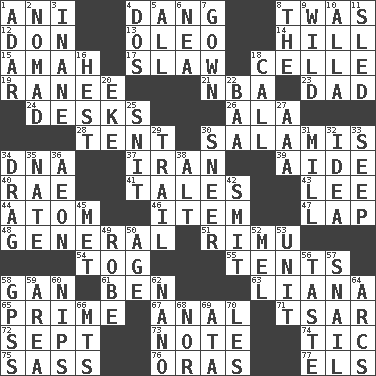 ACROSS 1. Black tropical American cuckoo 4. Mild oath, euphamism for damn 8. It was, poetically 12. Spanish title 13. Margarine 14. Land elevation 15. Nursemaid 17. Cole _ (cabbage dish) 18. Cell (Danish) 19. The wife of a rajah (variant) 21. Basketball assoc. 23. June honoree 24. Writing tables 26. Wing 28. Portable shelter 30. Deli grouping 34. Heredity factor (abbr.) 37. SW Asia republic 39. Helper 40. Actress Charlotte 41. Falsehoods 43. Area sheltered from the wind 44. Tiny particle 46. A distinct part 47. Infant locale 48. Commissioned military rank 51. Tall New Zealand timber tree 54. Coat; cloak 55. Portable shelters 58. Separate the seeds from cotton 61. Benjamin's nick name 63. Woody, climbing, usually tropical plant 65. First class 67. Of or related to the anus 71. Russian ruler of old 72. Back-to-school mo. 73. Musical sound 74. Nervous spasm 75. Backtalk 76. Mouths or openings 77. Raised railways DOWN 1. The sixth month of the Jewish calendar 2. Roamer 3. Silly 4. Two (Sp.) 5. Everything 6. Teachers' org. 7. Bride's dress 8. Definite Article 9. Rampant 10. Silent film actress Nazimova 11. Downhill vehicle 16. Command 18. Give a ring to 20. Make supply last 22. Sound made by sheep 25. In a ____ (agitated or irritated) 27. Auto club (abbr.) 29. Get behind 30. Scornful expression 31. Place where flour is made 32. It may be bright or harebrained 33. Ooze 34. To trail on the ground 35. Nathan's nickname 36. Period of immesurable duration 38. Keyboard modifier key 42. Stricken, poetically 45. Was introduced to 49. Loose flowing garment 50. Mature 52. Cartoonist voice _ Blanc 53. A single undivided whole 56. Clothes sense 57. Slow-paced one 58. Global Positioning Systems (abbr.) 59. Type of rug 60. Cuts off 62. Billionth: prefix 64. Curves 66. Mountains (abbr.) 68. And not 69. "One Day ___ Time" 70. French article