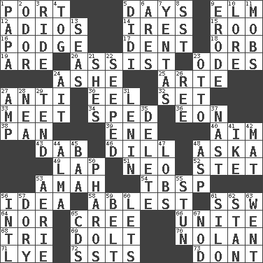 ACROSS 1. Sweet dark-red dessert wine 5. 24-hour periods 9. Shade tree 12. Goodbye (Sp.) 14. Angers 15. Friend of Pooh 16. Puddle 17. Undesirable depression on a surface 18. Globe 19. "We ___ not amused" (Victoria) 20. Help 23. Lyric poems 24. American tennis player Robert 25. Johnson of "Laugh-In" 27. Against 30. Snakelike fish 32. Put into a specified state 33. Rendezvous 34. Hurried 36. A really long time 38. Baking dish 39. Compass dir. 40. Direct toward a target or goal 43. Apply (a substance) by light strokes 46. Deli pickle 48. "____ silly question..." 49. Infant locale 51. Modern: prefix 52. Proofreading order 53. Housemaid 54. Cook's measure (abbr.) 56. It may be bright or harebrained 58. Most capable 61. Compass dir. 64. And not 65. Algonquian 66. Join together 68. Three (prefix) 69. Stupid person 70. Pitcher Ryan 71. Potassium hydroxide 72. Fast planes 73. Do not DOWN 1. Dad 2. Scent 3. Travel on an animal 4. Coat; cloak 5. "You Light Up My Life" star Conn 6. Ancient Greek god of war 7. Gossips 8. Fast jet (abbr.) 9. Wear away 10. Old wives' tales, e.g. 11. Disorderly crowds 13. Oceans 21. "______ My Girl" (Turtles hit) 22. Oozed 23. Von Bismarck 24. Small island 26. To separate or throw off 27. Electrical Unit 28. Teachers' org. 29. Watch over 31. Soviet premier 1918-24 35. Keyboard key 37. Political cartoonist Thomas 41. Mamie's mate 42. Floor protector 44. _ mater 45. Sound made by sheep 47. Tennis shots 48. Cleo's killer 50. N Egypt peninsula 53. Nest on high 55. Astound 56. International (abbr.) 57. Rowboat 59. Waist strap 60. Allows 61. Grain storage tower 62. Comedian Laurel of Laurel & Hardy 63. Gone 65. Music discs 67. Dreamland