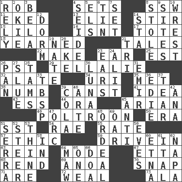 ACROSS 1. Director Reiner 4. Puts into a specified state 8. Compass dir. 11. Made supply last 13. Writer Wiesel 14. Use a spoon 15. _ and Stitch 16. Is not 17. Lug 18. Had a strong desire 21. Falsehoods 22. Create 23. Hearing organ 25. Eastern Standard Time (abbr.) 26. Pacific Standard Time (abbr.) 29. Copy Pinocchio 32. Having winglike extensions 34. RI univ. 35. Was introduced to 38. Unfeeling 39. 2nd pers. sing. pres. of can (arch.) 41. The content of cognition 43. Curvy letter 44. Mouth or opening 45. Believer in; advocate of (suffix) 46. Characterized by complete cowardliness 50. Epoch 51. Fast jet (abbr.) 54. Actress Charlotte 55. Assign a rank or rating to 57. Moral principle 59. Popular '50s hangout 63. It's straight from the horse's mouth 64. Method 67. Singer James 68. Tear apart 69. Small Philippine buffalo 70. Fastener 71. "We ___ not amused" (Victoria) 72. Welt 73. In the manner of DOWN 1. Trust 2. Migrant worker of the '30s 3. Actor Lugosi 4. A glass for beer 5. Raised railways 6. Metal container 7. Put into a specified state 8. Took without asking 9. Settings 10. Take or capture by force 12. Dormintory (informal) 14. R.R. building 19. Nathan's nickname 20. Make supply last 21. Three (prefix) 23. Hearing organs 24. Set down 26. Baking dish 27. Turn sharply 28. Scottish caps 30. Type of eclipse 31. Independent ruler or chieftain 33. Cook's measure (abbr.) 36. Singer Brickell 37. Pull apart 39. Root beer relative 40. Johnson of "Laugh-In" 42. Santa ___, CA 45. Opposed to 47. The grampus (Milton) 48. Severe or trying experience 49. Boat paddle 51. Father Junipero _ 52. Bull 53. One or ones belonging to thee 56. Nights before holidays 58. Indiana (abbr.) 60. Inactive volcano in Sicily 61. Slanted text style (abbr.) 62. California wine valley 64. Opening into something insatiable 65. Single 66. ___ good deed