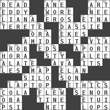ACROSS 1. Necklace unit 5. One (Scot) 8. Nonscientific branch of learning 11. Whirlpool 12. Had on 14. Born 15. Woody, climbing, usually tropical plant 17. Greek god of love 18. Inactive volcano in Sicily 19. Cylindrical with tapered ends 21. Hyrax 23. Mouth or opening 25. Supplements with great effort 26. Among 27. Be seated 28. By way of 31. Director Reiner 33. Begley and Asner 35. To the left, to Queeg 37. Israeli folk dance 38. Filthy place 40. Toward shelter 41. Having winglike extensions 43. Actress Gardner 45. ___ a Wonderful Life 46. French article 47. Atlas unit 50. Liveliness 52. Grain storage tower 53. Male offspring 54. Portable computer 56. Principles of right and wrong 61. Root beer relative 62. Soared 65. Sir (Sp.) 66. Chief or king in Benin or Nigeria 67. Prong on a fork 68. Needle holder 69. Air pressure measure (abbr.) 70. Fish or hair follower 71. Chops off DOWN 1. Waist strap 2. Singer Brickell 3. The sixth month of the Jewish calendar 4. Unit of force 5. Deep reverence 6. And not 7. Eats (away) 8. Against 9. French philosopher Descartes 10. Beverage made from leaves 13. 1973 Nobel Price Winner (Physics) Leo 16. Tiny particle 18. Double-curved letter 20. 4th largest of the Great Lakes 22. Bristle 24. Sums up 26. Blind as ____ 28. Electrical Unit 29. Angers 30. Had dinner 31. Hero or heavy, e.g. 32. Mouths or openings 34. R.R. building 36. Ache 37. Actor Linden 39. Jacques Cousteau's middle name 42. Send forth 44. Medicinal plant 48. High up in or into the air 49. Cotton for raincoats, e.g. 51. Pismires 52. Health resort 54. Tennis shots 55. Mountain range southwest of Kyrgyzstan 57. Person who is morally reprehensible 58. To the inside or interior of 59. Clever action or accomplishment 60. Indian titles of respect 61. Police officer (slang) 63. Compass dir. 64. Dripping