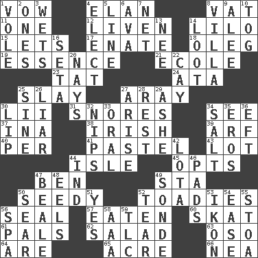 ACROSS 1. Promise 4. Flair 8. Large container 11. Single 12. Make or become more lively 14. _ and Stitch 15. Allows 17. Related on the mother's side 18. Cassini of fashion 19. Substance 21. Learning spot: Fr. 23. Make lace 24. _ moment's notice (2 wds.) 25. Kill 27. Like ___ of sunshine 30. Cards in a Roman deck? 31. Sounds asleep 34. Observe 37. _ tizzy (2 wds.) 38. From or relating to Ireland 39. Sandy's bark 40. For each 41. Soft color 43. Car dealer's back yard 44. Capri or Wight 45. Chooses 47. Benjamin's nick name 49. R.R. building 50. Sleazy 52. Sycophants 56. Lick closed 57. Eroded 60. Three-handed card game 61. Friends 62. First course 63. Bear (Spanish) 64. "We ___ not amused" (Victoria) 65. Measure of real estate 66. Teachers' org. DOWN 1. Grand slam 2. Singles 3. Soaks 4. Choose 5. Actor's bit 6. Actress Gardner 7. Fish or hair follower 8. Country estate 9. Toward shelter 10. Coat; cloak 13. Born 14. Plunder 16. Bristle 20. Negative votes 22. Island 25. Trig term 26. One who doesn't tell the truth 27. Get up 28. Respite 29. American tennis player Robert 30. Mouth edge 32. Cuts off 33. Taken by mouth 34. Table seasoning 35. Greek god of love 36. Lizard (obsolete) 42. Globular water bottle used in Asia 44. Working for oneself (abbr.) 46. Writing tablets 47. Calif. Air Force Base 48. Snakelike fish 49. Message 50. Burn superficially 51. Consenting reply 52. Separate forcefully 53. Visual representation of an object 54. Relaxation 55. Portico 56. Health resort 58. Auto club (abbr.) 59. Affectionate concern, for short
