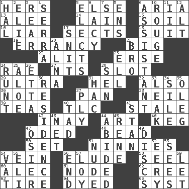 ACROSS 1. Possessive pronoun 5. Otherwise 9. Operatic vocal solo 13. Toward shelter 14. (Had) reclined 15. Earth 16. One who doesn't tell the truth 17. Religious groups 18. Costume for a special activity 19. The state or an instance of erring 21. Of large size 22. Set down 23. Celtic language 24. Actress Charlotte 27. Mountains (abbr.) 28. Notch 29. Extreme 31. Cartoonist voice _ Blanc 32. In addition 36. Brief written record 37. Baking dish 38. Famous astronaut Armstrong 39. Beverages made from leaves 40. Affectionate concern, for short 41. Lacking originality or spontaneity 42. "If ____ say so..." 44. Tate display 46. Cask 47. Wrote a lyric poem 48. Necklace unit 50. Arrange properly for use 51. Simpletons 54. Distinctive style or manner 56. Evade 58. Stitch closed the eyes of (a falcon) 60. Actor Baldwin 61. Connecting point 62. Algonquian 63. Hoop that covers a wheel 64. Colored 65. System (abbr.) DOWN 1. Actor Linden 2. Writer Wiesel 3. Bring up, as a child 4. Spanish missionary in California 5. Opts 6. Made of lace 7. Be seated 8. Followers of ems 9. Helper 10. Makeup applied to the cheeks 11. One more than two 12. Keyboard modifier key 17. In a ____ (agitated or irritated) 20. _ mater 21. Sis' sibling 23. Pipe bend 24. Undersized animal 25. _ vera 26. Singer James 28. Elected rep. 30. Home 31. Big _ 33. Path through which fluid escapes 34. Filth; sediment 35. Cassini of fashion 37. Travel a route regularly 40. Small boy 41. Comedian Laurel of Laurel & Hardy 43. Was introduced to 44. Remained 45. French philosopher Descartes 47. Flexible twig of a willow tree 49. Flat circles 51. Unadorned 52. Suggestive of the supernatural 53. Perceives with the eye 54. Large container 55. Biblical high priest 56. Conclude 57. Myrna of the movies 59. Allow