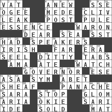 ACROSS 1. Large container 4. Afresh 8. Compass dir. 11. Double curve, resembling the letter S 13. Ancient Persian 14. 154 in Roman numerals 15. Path through which fluid escapes 16. Mail 17. Whimper 18. Substance 21. Make _____ (do battle with) 22. Letter starter 23. Ocean 25. Fast jet (abbr.) 26. Possessed 29. Orators 32. From or relating to Ireland 34. At a great distance 35. Epoch 38. Sew up the eyelids of hawks and falcons 39. Simple song 41. Bar bills 43. Nursemaid (var.) 44. Had dinner 45. Timepiece 46. Head of state? 50. Compass dir. 51. White ___ sheet 54. Symbol (abbr.) 55. Collude with 57. To gather and bind into a bundle 59. Flamboyance 63. "Two Mules for Sister ____" 64. Close up, plug up 67. Seize upon or latch onto something 68. Operatic vocal solo 69. Migrant worker of the '30s 70. Indian skirt 71. Binary compound 72. Disposed of to a purchaser 73. Floor protector DOWN 1. Grand slam 2. Eras 3. Afternoon social gatherings 4. Electrical Unit 5. Modern: prefix 6. Begley and Asner 7. Dripping 8. Runs notes together 9. Grain storage towers 10. Happening 12. Made supply last 14. Tax preparer (abbr.) 19. Delicate 20. Head covering 21. Armed conflict 23. Three-handed card game 24. Suggestive of the supernatural 26. Part of HMS, perhaps 27. Type of rug 28. South Vietnam president (1954) 30. Following 31. Bristle 33. Volcanic refuse 36. Pace 37. Lettered men learn these first 39. American folk hero Crockett 40. A whole individual unit 42. A female animal or person 45. Songbird 47. Order of Saint Francis (abbr.) 48. Slept 49. Chief or king in Benin or Nigeria 51. Slender Brazilian palm 52. Broken piece 53. Nest on high 56. Labels 58. Auto club (abbr.) 60. Burrowing marine mollusk 61. Israeli folk dance 62. Send forth 64. Distress signal 65. Ring climax 66. Petroleum