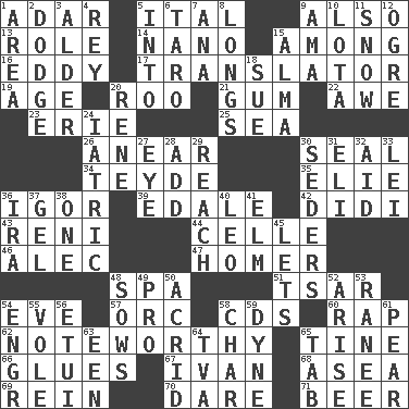 ACROSS 1. The sixth month of the Jewish calendar 5. Slanted text style (abbr.) 9. In addition 13. Hero or heavy, e.g. 14. Billionth: prefix 15. Amid 16. Whirlpool 17. Interpreter 19. Ripen 20. Friend of Pooh 21. Chewing product 22. Deep reverence 23. 4th largest of the Great Lakes 25. Ocean 26. Approach 30. Lick closed 34. Miss Universe 1986, Barbara Palacios _ 35. Writer Wiesel 36. Russian composer Stravinsky 39. Peak District village in England 42. "You Light Up My Life" star Conn 43. Painter Guido (1575-1642) 44. Cell (Danish) 46. Actor Baldwin 47. Homing pigeon 48. Health resort 51. Russian ruler of old 54. Night before a holiday 57. The grampus (Milton) 58. Music discs 60. Hit sharply and swiftly 62. Music shop? 65. Prong on a fork 66. Adhesives 67. _ the terrible 68. Toward the sea 69. It's straight from the horse's mouth 70. Have the gumption 71. Fermented drink made from hops DOWN 1. Length times width 2. Evade 3. Tree or shrub in the Birch family 4. Marina Del _, California 5. To the inside or interior of 6. Pacific island yam 7. Santa ___, CA 8. Yearns 9. Housemaid (var.) 10. Globular water bottle used in Asia 11. Overwhelm 12. Legendary monster 15. _ mater 18. Take to court 20. French philosopher Descartes 24. Of or pertaining to medicine 27. Sight organ 28. Find the sum of 29. Arrive at 30. Spring feasts 31. Connecticut Ivy Leaguer 32. Assist 33. Luau accessory 36. Lyricist Gershwin 37. Set 38. Single 40. Lion 41. Shade tree 45. Allows 48. Sty mamas 49. Adept person 50. Sour-tasting 52. Originate 53. The wife of a rajah (variant) 54. Engineer (abbr.) 55. Grand slam 56. Needle holder 58. Burn to charcoal 59. Unit of force 61. Lightbulb-shaped fruit 63. Car or cant ending 64. Federal power corp. 65. Bar bill