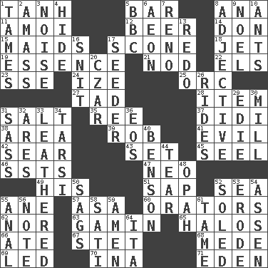 ACROSS 1. Hyperbolic tangent 5. Oblong piece of solid material 8. Santa ___, CA 11. Mine, in Marseilles 12. Fermented drink made from hops 14. Spanish title 15. Unmarried girls 17. Biscuitlike quick bread 18. Type of plane 19. Gist 21. Lower and raise head in agreement 22. Raised railways 23. Compass dir. 24. Ending with capital 25. The grampus (Milton) 27. Small amount or degree 28. A distinct part 31. Table seasoning 35. To riddle 37. "You Light Up My Life" star Conn 38. Length times width 39. Director Reiner 41. Morally bad or wrong 42. Singe 43. Put into a specified state 45. Sew up the eyelids of hawks and falcons 46. Fast planes 47. Modern: prefix 49. Part of HMS, perhaps 51. Plant excrement 52. Ocean 55. A saturated hydrocarbon 57. White ___ sheet 60. Speakers 62. And not 63. Street urchin 65. Auras 66. Had dinner 67. Proofreading order 68. Ancient Persian 69. Directed 70. _ tizzy (2 wds.) 71. Genesis locale DOWN 1. Corrects by punishment or discipline 2. Collect or gather 3. Annoying sound 4. Flintstone garb 5. English channel? 6. Period of immesurable duration 7. Western Nevada city 8. Descriptive word 9. Christmas carol 10. Pismires 13. Make new 16. In a ____ (agitated or irritated) 17. Sowing specialist 20. Russian ruler of old 26. Amusement-park features 29. Singer Brickell 30. Place where flour is made 31. Backtalk 32. Ancient Greek god of war 33. Tough but pliablecoriaceous 34. Tarsus (plural) 36. Greek goddess of the dawn 40. Gillaume's butler role 44. Separate forcefully 48. Brightly colored fish 50. Settles 52. Having a sole or soles 53. Wear away 54. NE Netherlands city 55. Of or related to the anus 56. Musical sound 58. Suttee (variant) 59. So be it 61. Docile 64. Call ___ day