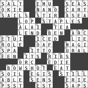 ACROSS 1. Table seasoning 5. Australian flightless bird 8. Oceans 12. Migrant worker of the '30s 13. Billionth: prefix 15. Draw slowly or heavily 16. Travels by water 18. Move through with a circular motion 19. Toward the sea 20. Chop off 22. Paper fasteners 24. Jai ____ 26. Afternoon social gathering 27. Grant temporary use of 28. Benjamin's nick name 29. Curve 32. Needle case 35. On the rocks 37. Falsehood 38. Hero or heavy, e.g. 39. Clumsy lout 40. Wise men 41. Health resort 42. "Tell ____ the Marines!" 43. Mountain range 44. Car or cant ending 45. It is 46. Chest bones 49. The grampus (Milton) 50. Singer Brickell 51. The distance a bow sends an arrow 55. Consume 56. Land 57. The front part of a cuirass 59. Free from disturbance or agitation 63. Competent 64. Elected reps. 65. 4th largest of the Great Lakes 66. Inconspicuous attention getter 67. Eastern Standard Time (abbr.) 68. Plant excrements DOWN 1. Distress signal 2. Alias (abbr.) 3. Cards in a Roman deck? 4. Copy Pinocchio 5. Followers of ems 6. Floor protectors 7. A single undivided whole 8. Any of the three canals of the cochlea 9. Comfort 10. Ancient Greek god of war 11. R.R. building 14. Declaimed 17. Flatfish 21. Baking dish 23. Fenced enclosure 25. Foolish or stupid persons 28. Prior to 29. Having or resembling wings 30. Port city in Latvia 31. To provide with a ceiling 32. Celtic language 33. Drink excessively 34. ____ Bator, Mongolia 36. Feline 40. French bagpipes 42. Strong, restless desires 45. Big collection agency 47. Binary compound 48. Prejudice 49. A small or young owl 51. Moves up and down 52. Petroleums 53. Double curve, resembling the letter S 54. Metal containers 56. Plant excrement 58. Fast jet (abbr.) 60. Lyricist Gershwin 61. Mouth edge 62. French article