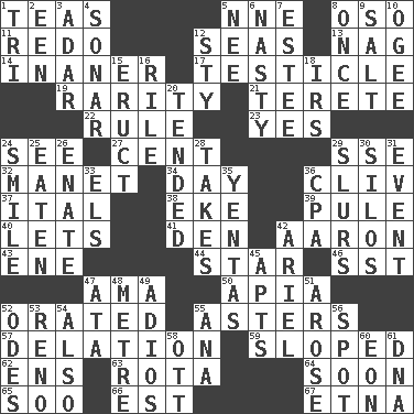 ACROSS 1. Afternoon social gatherings 5. Compass dir. 8. Bear (Spanish) 11. Make new 12. Oceans 13. Tired old horse 14. Sillier 17. One of the two male reproductive glands 19. Noteworthy scarcity 21. Cylindrical with tapered ends 22. Governing power 23. It is so 24. Perceive with the eye 27. Penny 29. Compass dir. 32. French painter Edouard 34. 24 hours 36. 154 in Roman numerals 37. Slanted text style (abbr.) 38. Supplement with great effort 39. Whimper 40. Allows 41. Lair 42. Composer Copland 43. Compass dir. 44. Play the lead 46. Fast jet (abbr.) 47. Nursemaid (var.) 50. Capital of Western Samoa 52. Declaimed 55. Michaelmas daisies 57. Conveyance 59. Inclined 62. Followers of ems 63. Roll call or roster of names 64. Within a short period 65. "Barney Miller" actor Jack 66. Eastern Standard Time (abbr.) 67. Inactive volcano in Sicily DOWN 1. Three (prefix) 2. Car or cant ending 3. The sixth month of the Jewish calendar 4. Underwater navigation system 5. Born 6. Offensive 7. First name in cosmetics 8. Single time 9. Table seasoning 10. Double curve, resembling the letter S 12. Filthy place 15. Spew [out] 16. Cause heat under the collar 18. Big collection agency 20. Watched over 24. Grin 25. Ingested 26. Maternal 28. Receives possession of 29. Disparaging remarks 30. Grain storage towers 31. Incident 33. Raised railways 35. Gossips 36. Tax preparer (abbr.) 42. Satellite of Uranus 45. Tenement units (abbr.) 47. "One Day ___ Time" 48. Distance measurement (Brit.) 49. Goodbye (Sp.) 51. Came up 52. Lyric poems 53. Former U.S. Attorney General Janet 54. In addition 55. Santa ___, CA 56. Specific locale 58. Baseball player Mel 60. A really long time 61. Heredity factor (abbr.)