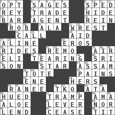 ACROSS 1. Choose 4. Gurus 9. Drove too fast 13. Marina Del _, California 14. Exchange 15. Flintstone garb 16. Drinking establishment 17. Rep 18. It's straight from the horse's mouth 19. Director Reiner 21. Wing 22. Take or capture by force 24. Give a ring to 26. Assist 27. Place in a line 29. Greek god of love 30. Amusement-park features 31. San ____ (Riviera town) 33. Wind 36. Biblical high priest 37. Pulling into pieces 40. Indian title of respect (Mr.) 41. Boy, to dad 42. Play the lead 43. Indian state 45. Carry 47. Aches 48. Compass dir. 49. Possessive pronoun 50. Indian princess (variant) 52. Ring climax 54. "One Day ___ Time" 56. Took on color 57. _____ steamer (cargo ship) 59. Nursemaid (var.) 61. _ vera 62. Prying instrument 63. Not either 64. Grant temporary use of 65. Stop 66. Teat (slang) DOWN 1. Globe 2. Lightbulb-shaped fruit 3. Polypeptide antibiotic 4. R.R. building 5. Therefore, facetiously 6. Highlander 7. Pulitzer Prize-winning author Ferber 8. Put into a specified state 9. Tears up 10. Sliced desserts 11. Prepare for publication 12. Lair 20. Object of repulsion 22. Make _____ (do battle with) 23. River (Sp.) 25. For fear that 27. Ancient Greek god of war 28. _ and Stitch 29. Arab leader 31. Assign a rank or rating to 32. Epoch 33. Aide 34. SW Asia republic 35. Basketball hoops 38. First name in cosmetics 39. Stare wonderingly 44. "Two Mules for Sister ____" 45. Watched over 46. Single 49. Residences 50. Court order 51. Period of immesurable duration 52. Family _ (genealogy) 53. Polynesian shrub of the pepper family 55. Mine, in Marseilles 56. Actor Linden 57. Affectionate concern, for short 58. Before (prefix) 60. Tate display