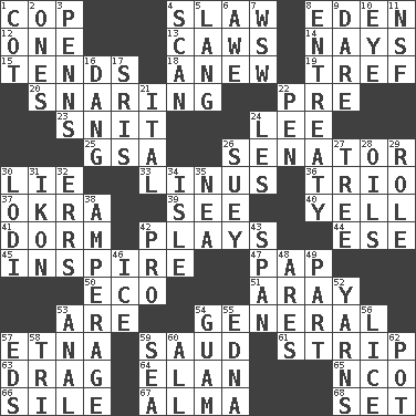 ACROSS 1. Police officer (slang) 4. Cole _ (cabbage dish) 8. Locale of original sin 12. Single 13. Crow sounds 14. Negative votes 15. Is inclined (to) 18. Afresh 19. Not kosher 20. Catching in a trap 22. Before (prefix) 23. In a ____ (agitated or irritated) 24. Area sheltered from the wind 25. Girls' org. (abbr.) 26. Legislator 30. Falsehood 33. "_ and Lucy" (Charlie Brown theme song) 36. Musical group of three 37. Gumbo ingredient 39. Perceive with the eye 40. Shout 41. Dormintory (informal) 42. Frolics 44. Compass dir. 45. Heighten or intensify 47. Infant food 50. Environmental prefix 51. Like ___ of sunshine 53. "We ___ not amused" (Victoria) 54. Commissioned military rank 57. Inactive volcano in Sicily 59. Saudi Arabian king (1953-1964) 61. Long narrow piece of something 63. To draw with force 64. Liveliness 65. Non-commissioned officer (abbr.) 66. Filth; sediment 67. _ mater 68. Arrange properly for use DOWN 1. Small bed 2. Washington bills 3. Actor Sean's family 4. Glance over 5. Long (Scottish) 6. Deep reverence 7. Compass dir. 8. Plea 9. Have the gumption 10. Sight organ 11. Science/research agcy. 16. Mild oath, euphamism for damn 17. Indian titles of respect 21. Slanted text style (abbr.) 22. Fenced enclosure 24. French article 26. Chop _ 27. Relationship diagram 28. Petroleums 29. Hero or heavy, e.g. 30. Farming town in central California 31. Visual representation of an object 32. Blunders 34. Capri or Wight 35. Teachers' org. 38. Electrical Measurement 42. Adept person 43. Connect, as a bridge 46. Frozen water 48. Ancient Greek god of war 49. Piece 52. Entertaining tales 53. Of or related to the anus 54. Island territory of the United States 55. Pulitzer Prize-winning author Ferber 56. Louse (plural) 57. Begley and Asner 58. Three (prefix) 59. Ocean 60. 100% 62. Cooking vessel