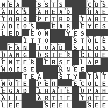ACROSS 1. Teachers' org. 4. Fast planes 8. Music discs 11. Curves 13. At or in the front 15. Actress Charlotte 16. "Corrida" creature 17. Stone: prefix 18. Small pie 19. Goodbye (Sp.) 21. Ewer handle 22. Sight organs 23. Directed 24. Period of immesurable duration 27. Affirmative reply 29. "Tell ____ the Marines!" 30. Took without asking 34. Avid follower 36. Frog relative 39. Grain storage towers 40. Mild oath, euphamism for damn 41. Flexible twig of a willow tree 43. A slight indication 44. Keyboard key 46. Celtic language 47. Pet locale 48. Annoying sound 49. Leg joint 51. Beverage made from leaves 53. Filthy place 54. Make lace 57. Musical sound 60. For each 63. Learning spot: Fr. 65. Mild oath 66. Feeling or showing extreme anger 69. Brightly colored fish 70. 100% 71. Nick name for Arthur 72. Carryall 73. Area sheltered from the wind 74. Stitch closed the eyes of (a falcon) 75. Observe DOWN 1. Relating to or accompanying birth 2. Wear away 3. Bitter 4. Plant excrement 5. A female animal or person 6. False hair 7. "Two Mules for Sister ____" 8. Supercomputer manufacturer 9. Have the gumption 10. Puts into a specified state 12. "Barney Miller" actor Jack 14. Dinghy 18. One of the two male reproductive glands 20. Arrange properly for use 25. "Beetle Bailey" pooch 26. Trap for birds or small mammals 28. Curvy letter 29. Eaten 31. Spanish pot 32. Central Nebraska county 33. Compass dir. 34. Papal veil 35. Opposed to 37. Wind 38. Writing tables 40. Lair 42. Monthly bill 45. To sift 50. Sight organ 52. Capital of Western Samoa 54. Literary convention 55. Having winglike extensions 56. Giggle 57. Be tempered by heat 58. Stare 59. Falsehood 61. Blunders 62. Assign a rank or rating to 64. Small bed 67. Standoff 68. Snakelike fish