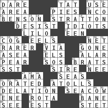 ACROSS 1. Have the gumption 5. Make lace 8. Purpose 11. Length times width 12. Sliced desserts 13. Non-commissioned officer (abbr.) 14. Gillaume's butler role 17. Ski resort town in Vermont 19. Stop 21. Foolish or stupid persons 22. _ and Stitch 23. Car or cant ending 24. Gear tooth 27. Snakelike fish 29. Fish or hair follower 32. More valued for its uncommonness 34. By way of 36. Went 37. At sea 38. Raised railways 39. Having or resembling wings 40. Lightbulb-shaped fruit 41. Mayday 42. Naughty children 43. Fast jet (abbr.) 44. Father 46. Born 47. Wet nurse (var.) 50. Oceans 52. Spoke pompously 55. Ringlike coral islands and reefs 57. Accusation by an informer 59. Manatee 62. Compass dir. 63. Round or rotation of duties 64. Object of repulsion 65. Observe 66. Eastern Standard Time (abbr.) 67. Proofreading order DOWN 1. Pat or tap gently 2. "We ___ not amused" (Victoria) 3. Tear apart 4. Artist's stand 5. Teat (slang) 6. Nest on high 7. Sadhe (variant) 8. To (old English) 9. Highlander 10. Immeasurably long periods of time 12. Pacific Standard Time (abbr.) 15. Flexible twig of a willow tree 16. "Death on the ____" 18. Metal container 20. Finds the solution 24. Dice game 25. Fertile tracts in a desert 26. Relatively large 28. Grain storage towers 29. Pitcher Ryan 30. Maternal 31. Laconic 33. Hearing organ 35. Help 36. Slender fish 42. Memphis, Tenn. Street 45. Vintage cars 47. "One Day ___ Time" 48. Distance measurement (Brit.) 49. Goodbye (Sp.) 51. Thick slices 52. Lyric poems 53. French philosopher Descartes 54. Toward shelter 55. Santa ___, CA 56. Scram, to a cat 58. Baseball player Mel 60. Single 61. Soggy