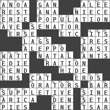 ACROSS 1. Small Philippine buffalo 5. Separate the seeds from cotton 8. Toward shelter 12. State of inaction 13. Santa ___, CA 14. Sibling's daughter 15. 4th largest of the Great Lakes 16. Census information 19. "___ Maria" 20. Elected representative 21. Celtic language 23. And so on (abbr.) 24. ___ a Wonderful Life 27. Straggles 30. Angers 31. City in Syria 34. Political cartoonist Thomas 35. Electrical Unit 38. Relating to or accompanying birth 40. Pismires 41. Singer Brickell 42. Food allowance for one day 44. Tear apart 45. Flintstone garb 46. Followers of ems 47. Feline 50. Greek god of love 53. Speakers 57. Drinking establishment 59. Supplying deficiencies 63. Trig term 64. N. Chile seaport 65. Lair 66. Bristle 67. Sliced desserts 68. Compass dir. 69. Russian ruler of old DOWN 1. Length times width 2. Boldness 3. Flexible twig of a willow tree 4. Had dinner 5. Yawn 6. Soon (poet.) 7. California wine valley 8. Small island 9. Luau accessory 10. Environmental prefix 11. Car or cant ending 14. Drug cop 17. Shoshoni 18. Car dealer's back yard 20. Lick closed 22. Scheduled 24. SW Asia republic 25. Trial 26. Fast planes 28. Commissioned mil. rank 29. Practice fight 30. More lacking in sense or substance 32. Parent Teacher Assoc. 33. Pledge 35. We are 36. An important port of Yemen 37. Metal containers 39. Cards in a Roman deck? 43. Lyric poems 47. Root beer relative 48. "We ___ not amused" (Victoria) 49. Make lace 51. Off-Broadway awards 52. Before Barbara or Clara 54. Periodic rise and fall of the sea level 55. Baking chamber 56. French philosopher Descartes 58. Stern 59. Plant excrement 60. RI univ. 61. Sliced dessert 62. Personal Computers (abbr.) 63. Fast jet (abbr.)