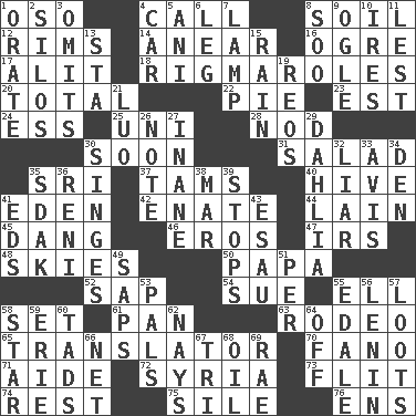 ACROSS 1. Bear (Spanish) 4. Give a ring to 8. Earth 12. Basketball hoops 14. Approach 16. Legendary monster 17. Came down and settled, as after flight 18. Complicated, petty procedures 20. Add up to 22. Sliced dessert 23. Eastern Standard Time (abbr.) 24. Curvy letter 25. Single; one (prefix) 28. Allow head to fall sleepily 30. Within a short period 31. Vegetable dish 35. Indian title of respect (Mr.) 37. Scottish caps 40. Hub of activity 41. Genesis locale 42. Maternal 44. (Had) reclined 45. Mild oath, euphamism for damn 46. Greek god of love 47. Big collection agency 48. Atmospheres 50. Dad 52. Plant excrement 54. Take to court 55. Pipe bend 58. Arrange properly for use 61. Baking dish 63. Cowboy competition 65. Interpreter 70. Papal veil 71. Assistant 72. Damascus' land 73. Secret move to avoid paying debts 74. State of inaction 75. Filth; sediment 76. Followers of ems DOWN 1. Declaim 2. Grain storage towers 3. Leaves out 4. Automobile 5. Cuckoo 6. Part of a journey 7. Desk light 8. "Barney Miller" actor Jack 9. Stare at amorously 10. Angers 11. For fear that 13. R.R. building 15. Precipitation 19. Vintage cars 21. Nilotic language 26. Observe 27. Lacking in sense or substance 29. Mexican or Central American flower 30. Scorches 32. One who doesn't tell the truth 33. Opinion 34. Lair 35. Neighbor of Neb. 36. Painter Guido (1575-1642) 38. Third mo. 39. Closes up, plugs up 41. Begley and Asner 43. Son of Isaac 49. Plant excrements 51. For each 53. Friends 55. Peak District village in England 56. Soviet premier 1918-24 57. Plunders 58. Play the lead 59. 4th largest of the Great Lakes 60. Bits 62. Negative votes 64. Not in operation 66. Remaining after all deductions 67. Three (prefix) 68. Lubricate 69. Actress Charlotte