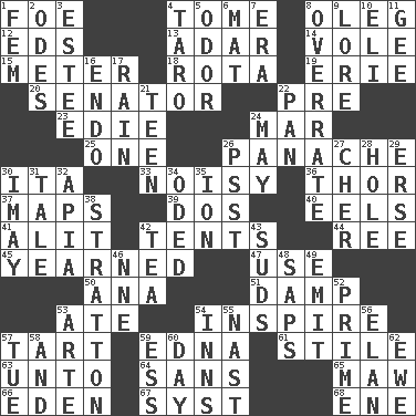 ACROSS 1. Enemy 4. Heavy book 8. Cassini of fashion 12. Begley and Asner 13. The sixth month of the Jewish calendar 14. Short-tailed, large-bodied rat 15. Distance measurement 18. Roll call or roster of names 19. One of the Great Lakes 20. Elected representative 22. Before (prefix) 23. Singer Brickell 24. Impair 25. Single 26. Flamboyance 30. Call ___ day 33. Annoyingly loud 36. Son of Odin 37. Atlas contents 39. Two (Sp.) 40. Snakelike fish 41. Set down 42. Portable shelters 44. Portuguese money of account (variant) 45. Felt deep pity or tenderness 47. Purpose 50. Santa ___, CA 51. Moist 53. Had dinner 54. Stimulate to action 57. Small pie 59. Pulitzer Prize-winning author Ferber 61. Vertical member of a panel or frame 63. To (old English) 64. Without 65. Informal term for the mouth 66. Locale of original sin 67. System (abbr.) 68. Compass dir. DOWN 1. Opposite of masc. 2. Lyric poems 3. First name in cosmetics 4. Edible starchy tuberous root 5. Scent 6. Floor protector 7. Period 8. Make much ado about nothing 9. Old wives' tales, e.g. 10. Biblical high priest 11. Turn to the right 16. Inside; within (prefix) 17. Water falling in drops from the sky 21. Adolescent 22. Baking dish 24. Can I? 26. Inconspicuous attention getter 27. "Mermaids" star 28. Hollow 29. Celtic language 30. "If ____ say so..." 31. Lie 32. Capital of Western Samoa 34. Wrote a lyric poem 35. Electrically charged atom 38. Ski resort town in Vermont 42. Afternoon social gathering 43. Soap bubbles 46. Compass dir. 48. Plant excrements 49. Give off 52. First class 53. Johnson of "Laugh-In" 54. Taverns 55. Political cartoonist Thomas 56. Enthusiasm 57. Third day of the wk. 58. Added to 59. Double-curved letter 60. 24 hours 62. She-sheep