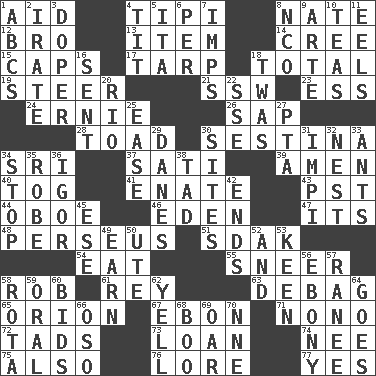 ACROSS 1. Help 4. Native american tent (variation) 8. Nathan's nickname 12. Sis' sibling 13. Detail 14. Algonquian 15. Balmoral and tarboosh 17. Canvas cover 18. "_____ Recall" 19. Guide 21. Compass dir. 23. Curvy letter 24. Bert's buddy 26. Plant excrement 28. Frog relative 30. French poetic form 34. _ Lanka 37. Suttee (variant) 39. So be it 40. Coat; cloak 41. Maternal 43. Pacific Standard Time (abbr.) 44. Mitch Miller's instrument 46. Paradise 47. ___ a Wonderful Life 48. Son of Zeus who helped slay Medusa 51. Neighbor of Neb. 54. Erode 55. Contemptuous expression 58. Director Reiner 61. Marina Del _, California 63. Debunk (Brit. slang) 65. Constellation of myth 67. Inky black, to poets 71. Words to Nanette 72. Bits 73. Grant temporary use of 74. Born 75. In addition 76. Old wives' tales, e.g. 77. Consenting reply DOWN 1. Lettered men learn these first 2. Feeling or showing extreme anger 3. Drug addict 4. Teat (slang) 5. Call ___ day 6. For each 7. Naughty children 8. Non-commissioned officer (abbr.) 9. Johnson of "Laugh-In" 10. Beverages made from leaves 11. Snakelike fish 16. Transmitted 18. It was, poetically 20. River (Sp.) 22. Compass dir. 25. Relaxation 27. Parent Teacher Association (abbr.) 29. Natives or inhabitants of Denmark 30. Locates 31. Body of Kaffir warriors 32. A home for chicks 33. Pismires 34. Discontinue 35. Loose flowing garment 36. Russian composer Stravinsky 38. Small boy 42. Extremities 45. Compass dir. 49. Merit 50. Shoshoni 52. Added to 53. Peachy ____! 56. Black 57. Indian princess (variant) 58. Round or rotation of duties 59. Relating to the mouth 60. Auction offers 62. Shout 64. Moves 66. Bear (Spanish) 68. Surprise greeting 69. Boat paddle 70. Compass dir.