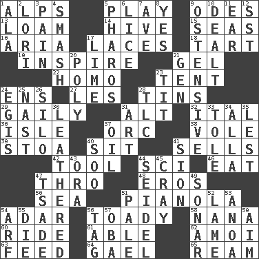 ACROSS 1. High mountains 5. Frolic 9. Lyric poems 13. Rich soil 14. Hub of activity 15. Oceans 16. Roberta Peters solo 17. Shoestrings 18. Small pie 19. Motivate 21. Set 22. Like (prefix) 23. Portable shelter 24. Followers of ems 27. French article 28. Airtight sealed metal containers 29. Lightheartedly 31. The first octave above the treble staff 32. Slanted text style (abbr.) 36. Capri or Wight 37. The grampus (Milton) 38. Grand slam 39. Portico 40. Be seated 41. Exchanges for money 42. Utensil 44. _-fi 46. Erode 47. Through, poetically 48. Greek god of love 50. Ocean 51. Player piano 54. The sixth month of the Jewish calendar 56. Sycophant 58. Nanny 60. Travel on or in a vehicle 61. Competent 62. Mine, in Marseilles 63. Nourish 64. Highlander 65. 480, 500 or 516 sheets of paper DOWN 1. Chicken ___ king 2. Australian parrot (variant) 3. Ache 4. Box-office sellout 5. N Egypt peninsula 6. Louse (plural) 7. "___ Maria" 8. It is so 9. Clearly or manifestly demonstrative 10. Started a card game 11. Ewer handle 12. Fast jet (abbr.) 17. Citrus frut 20. Much (prefix) 21. Commissioned military rank (abbr.) 23. Teat (slang) 24. Armor plate that protects the chest 25. Political cartoonist Thomas 26. Grain storage tower 28. Affectionate concern, for short 30. Resembling or made to resemble leather 31. Nonscientific branch of learning 33. Lacquered or enameled metalware 34. Silent film actress Nazimova 35. For fear that 37. Lubricate 40. "Barney Miller" actor Jack 41. The Jewish people; Israel 43. Mouth or opening 44. Beer mug 45. Supercomputer manufacturer 47. Sadhe (variant) 49. Underwater navigation system 51. Diluted with white 52. Unable to walk 53. Small Philippine buffalo 54. Sandy's bark 55. Expire 56. Label 57. Chief or king in Benin or Nigeria 59. Direct toward a target or goal