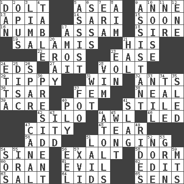 ACROSS 1. Dunce 5. Toward the sea 9. Singer Murray 13. Capital of Western Samoa 14. Indian skirt 15. Within a short period 16. Unfeeling 17. Indian state 18. Title for a man of rank and authority 19. Deli grouping 21. Part of HMS, perhaps 22. Greek god of love 23. Comfort 24. Begley and Asner 27. Small island 28. Electrical Unit 29. Likely to tip or tilt 31. Victory 32. Pismires 36. Russian ruler of old 37. Opposite of masc. 38. Actress Patricia 39. 43,560 square feet 40. Plant holder 41. Vertical member of a panel or frame 42. Grain storage tower 44. Leather borer 46. Directed 47. Municipality 48. Pull into pieces 50. Say or write further 51. Yearning 54. Trig term 56. Glorify 58. Dormintory (informal) 60. Northwest Algerian city 61. Morally bad or wrong 62. Prepare for publication 63. Table seasoning 64. Flaplike coverings 65. Elected reps. DOWN 1. Daniel's nick name 2. Musical composition 3. Pale green bean 4. Eating place 5. Aid 6. Backtalk 7. Period 8. Direct toward a target or goal 9. Helper 10. Annoying sound 11. Not either 12. Compass dir. 17. Mine, in Marseilles 20. Like ___ of sunshine 21. Actor Linden 23. Period of immesurable duration 24. Singer James 25. Compact _ 26. Coast Guard woman 28. Zeal 30. Elected leader of a country 31. Soggy 33. Famous astronaut Armstrong 34. Story 35. Downhill vehicle 37. Egg _ yung 40. Apply oneself diligently 41. Volcanic refuse 43. It would 44. Ringlike coral islands and reefs 45. Gone 47. Lessep's creation 49. Amusement-park features 51. Put down 52. Connecting point 53. Broad smile 54. Mayday 55. Lyricist Gershwin 56. Snakelike fish 57. 16 59. Mountains (abbr.)