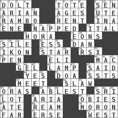 ACROSS 1. Dunce 5. Carry 9. Elected rep. 12. Believer in; advocate of (suffix) 14. Eras 15. Shoshoni 16. Role for Stallone 17. Monthly bill 18. _ tizzy (2 wds.) 19. Compass dir. 20. Slept 23. Slanted text style (abbr.) 24. Israeli folk dance 25. Immeasurably long periods of time 27. Drop; flow; fall 30. Double-curved letter 32. One of the 12 tribes of Israel 33. Image 34. Play the lead 36. Acura sports coupe 38. Animal enclosure 39. Biblical high priest 40. Big _ 43. Set 46. Desk light 48. Stated 49. It is so 51. ___ good deed 52. Fast planes 53. Rendezvous 54. Cole _ (cabbage dish) 56. Mouths or openings 58. Most capable 61. Indian title of respect (Mr.) 64. Car dealer's back yard 65. Roberta Peters solo 66. Off-Broadway awards 68. Had dinner 69. 480, 500 or 516 sheets of paper 70. Person of subnormal intelligence 71. At a great distance 72. Celtic language 73. 270 degrees DOWN 1. Have the gumption 2. NW Algerian seaport 3. Citrus frut 4. Keyboard key 5. Canvas cover 6. Double curve, resembling the letter S 7. Looked after 8. Eastern Standard Time (abbr.) 9. Sets or collections 10. Inactive volcano in Sicily 11. Be tempered by heat 13. Words to Nanette 21. Ancient Greek god of war 22. Soft color 23. Taverns 24. Layer 26. Rowing implement 27. Small drink 28. Eisenhower's nickname 29. Protracted 31. Vegetable dish 35. Full of chinks, cracks, or crevices 37. Dec. holiday 41. Small island 42. Music discs 44. Snake ____ (dice throw) 45. Area sheltered from the wind 47. Friends 48. Compass dir. 50. A viewer who gazes fixedly 53. Mother 55. Tiny particle 56. Norwegian king 57. Roll call or roster of names 59. Prejudice 60. Unable to walk 61. Male parent of an animal 62. Vintage cars 63. Is not 65. "We ___ not amused" (Victoria) 67. Arrow shooter