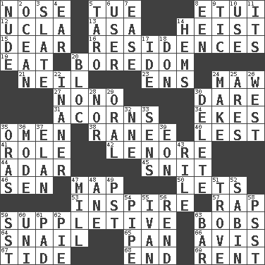 ACROSS 1. Olfactory organ 5. Third day of the wk. 8. Needle holder 12. Southern CA. univ. 13. White ___ sheet 14. Robbery 15. Letter starter 16. Homes 19. Ingest 20. Mood resulting from idleness 21. Famous astronaut Armstrong 23. Followers of ems 24. Opening into something insatiable 27. Words to Nanette 30. Have the gumption 31. Oak nuts 34. Makes supply last 35. Sign of things to come 38. The wife of a rajah (variant) 40. For fear that 41. Hero or heavy, e.g. 42. Poe poem 44. The sixth month of the Jewish calendar 45. In a ____ (agitated or irritated) 46. Elected rep. 47. Atlas unit 50. Allows 53. Motivate 57. Reproach for some lapse or misdeed 59. Supplying deficiencies 63. Moves up and down 64. Slow-paced one 65. Baking dish 66. Advice 67. Event that recurs at intervals 68. Conclude 69. Monthly bill DOWN 1. Naked 2. Sea 3. Schedule 4. Hearing organ 5. Edible starchy tuberous root 6. One who makes use of a thing 7. Comfort 8. Car or cant ending 9. Nervous spasm 10. Purpose 11. ___ a Wonderful Life 14. Is hesitant and indecisive 17. Binary compound 18. Spanish title 20. Group of countries in special alliance 22. More lacking in sense or substance 24. Cause to be 25. Ancient Greek god of war 26. Compass direction 28. Not either 29. Spoken 30. Erase 32. Compass dir. 33. Elected reps. 35. Mouths or openings 36. Method 37. Liveliness 39. Period of immesurable duration 43. Cause heat under the collar 47. Place where flour is made 48. A saturated hydrocarbon 49. Pacific Standard Time (abbr.) 51. Collection of objects 52. Unit of acoustic absorption 54. Corncob 55. _ the terrible 56. Tear apart 58. Inconspicuous attention getter 59. Fast jet (abbr.) 60. University (slang) 61. Writing tablet 62. Sliced dessert 63. Drinking establishment