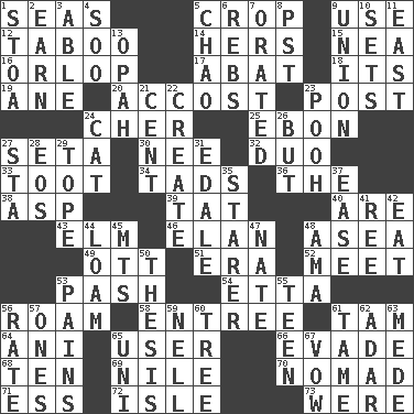ACROSS 1. Oceans 5. Riding implement 9. Purpose 12. Off limits 14. Possessive pronoun 15. Teachers' org. 16. Fourth or lowest deck 17. Blind as ____ 18. ___ a Wonderful Life 19. A saturated hydrocarbon 20. Buttonhole 23. Mail 24. "Mermaids" star 25. Inky black, to poets 27. Stalk of a moss capsule 30. Born 32. Superhero pair 33. A blast of a horn 34. Small amounts or degrees 36. Definite Article 38. Cleo's killer 39. Make lace 40. "We ___ not amused" (Victoria) 43. Shade tree 46. Style 48. Toward the sea 49. Baseball player Mel 51. Epoch 52. Rendezvous 53. Romantic infatuation 54. Singer James 56. Wander 58. Main course 61. Scottish cap 64. Cuckoo 65. One who uses or employs something 66. Dodge 68. "___ Little Indians" 69. "Death on the ____" 70. Roamer 71. Double-curved letter 72. Capri or Wight 73. Past tense of be (plural) DOWN 1. Portico 2. Merit 3. Competent 4. "Barney Miller" actor Jack 5. US Secretary of Labor Elaine L. _ 6. Confederate soldiers (slang) 7. Spoke pompously 8. Pacific Standard Time (abbr.) 9. The state of being joined or united 10. Puts into a specified state 11. Compass direction 13. Brightly colored fish 21. Penny 22. Cause to be 23. "Silly old bear" 24. Feline 26. Yet 27. R.R. building 28. Greek goddess of the dawn 29. Drink excessively 31. Peak District village in England 35. A viewer who gazes fixedly 37. Comfort 41. To separate or throw off 42. Ingest 44. Rich soil 45. Mountains (abbr.) 47. Nathan's nickname 48. Nanny (var.) 50. College paper 53. Aches 55. Adolescent 56. Pace 57. Washington bills 59. 1994 drama film starring Jodie Foster 60. Family _ (genealogy) 61. Docile 62. The sixth month of the Jewish calendar 63. Ancient Persian 65. Single; one (prefix) 67. Promise