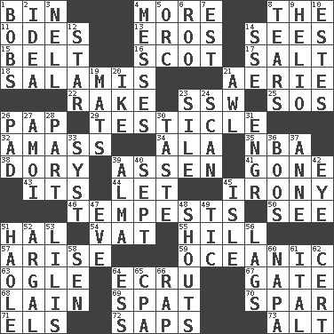 ACROSS 1. Storage container 4. Greater amount 8. Definite Article 11. Lyric poems 13. Greek god of love 14. Perceives with the eye 15. Waist strap 16. Native of Scotland 17. Table seasoning 18. Deli grouping 21. Nest on high 22. Immoral or dissolute person 23. Compass dir. 25. Mayday 26. Infant food 29. A testis 32. Collect or gather 34. According to 35. Basketball assoc. 38. Dinghy 39. NE Netherlands city 41. Went 43. ___ a Wonderful Life 44. Allow 45. Literary sarcasm 46. Storms 50. Perceive with the eye 51. Actor Linden 54. Large container 55. Land elevation 57. Get up 59. Pertaining to the sea 63. Stare at amorously 64. Shade of tan 67. Yard entry 68. (Had) reclined 69. Petty quarrel 70. Practice fight 71. Raised railways 72. Plant excrements 73. The first octave above the treble staff DOWN 1. Moves up and down 2. The content of cognition 3. 1994 drama film starring Jodie Foster 4. Makes clutter 5. The grampus (Milton) 6. Friend of Pooh 7. Eastern Standard Time (abbr.) 8. Rends 9. Sun: prefix 10. _____ Park, CO 12. Play the lead 14. Compass dir. 19. Floor coverings 20. Mamie's mate 21. Leather borer 23. Drop; flow; fall 24. Skim 26. Groovy apt. 27. Mine, in Marseilles 28. Role in a play 30. Clothes sense 31. Engineer (abbr.) 33. System (abbr.) 36. Expressions of contempt or scorn 37. Queen of England 1702-14 39. _ mater 40. Back-to-school mo. 42. Sight organ 45. Capri or Wight 47. First lady 48. Yells 49. Nervous spasm 51. White Person, in Hawaii 52. Therefore, facetiously 53. Ms. Damita and namesakes 56. Straggles 58. Elected rep. 60. California wine valley 61. Slanted text style (abbr.) 62. Certainty 64. Double-curved letter 65. Accounting whiz (abbr.) 66. Hit sharply and swiftly