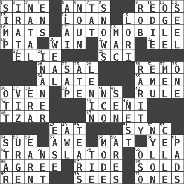 ACROSS 1. Trig term 5. Pismires 9. Vintage cars 13. SW Asia republic 14. Grant temporary use of 15. Inn 16. Floor coverings 17. Car 19. Parent Teacher Assoc. 20. Acquire through effort 21. Armed conflict 22. Snakelike fish 23. Writer Wiesel 25. _-fi 26. Rhinal 30. San ____ (Riviera town) 34. Having winglike extensions 35. So be it 36. Baking chamber 39. Actor Sean's family 42. Governing power 43. Hoop that covers a wheel 44. Ancient Celtic tribe of eastern Britain 46. Russian ruler 47. Music written for nine 48. Consume 51. Synchronize (abbr.) 54. Take to court 57. Deep reverence 58. Floor protector 60. Slangy assent 62. Interpreter 65. Spanish pot 66. Match 67. Travel on an animal 68. Exchanged or delivered for money 69. Monthly bill 70. Perceives with the eye 71. Singles DOWN 1. Simple or foolish person 2. Feeling or showing extreme anger 3. Brizilian seaport 4. Followers of ems 5. Jai ____ 6. Part of speech 7. Make lace 8. Overwhelms 9. Director Reiner 10. Singer Brickell 11. Stare at amorously 12. Sew up the eyelids of hawks and falcons 15. Australian parrot (variant) 18. Apple computer (short form) 20. Welt 24. Sillier 27. Plant excrement 28. Had dinner 29. Soviet premier 1918-24 30. Noteworthy scarcity 31. Australian flightless bird 32. Cartoonist voice _ Blanc 33. Single 36. Baseball player Mel 37. To wit 38. Period 40. Non-commissioned officer (abbr.) 41. Elected rep. 45. Egg locale 48. Relaxation 49. Leather borer 50. Separates forcefully 52. High-strength synthetic material 53. Cell (Danish) 54. Play the lead 55. Goad 56. Merit 58. Method 59. Ancient Greek god of war 61. Writing tablets 63. Remaining after all deductions 64. Standoff 65. Bear (Spanish)
